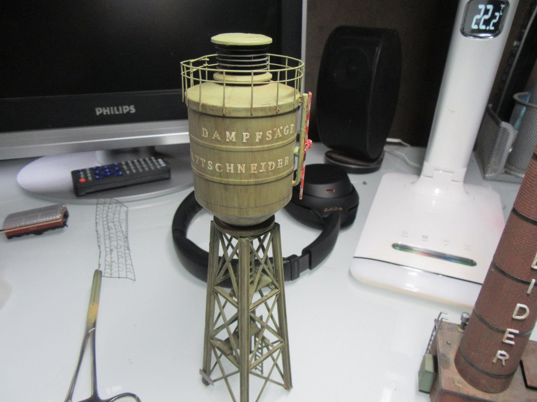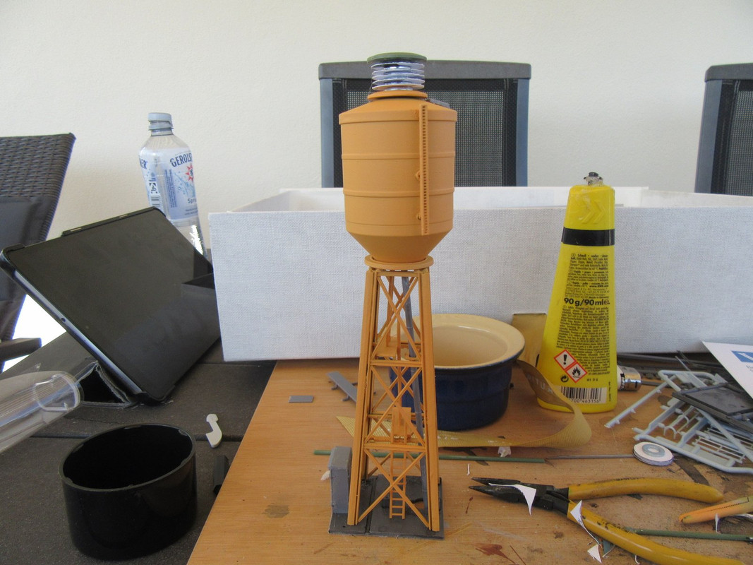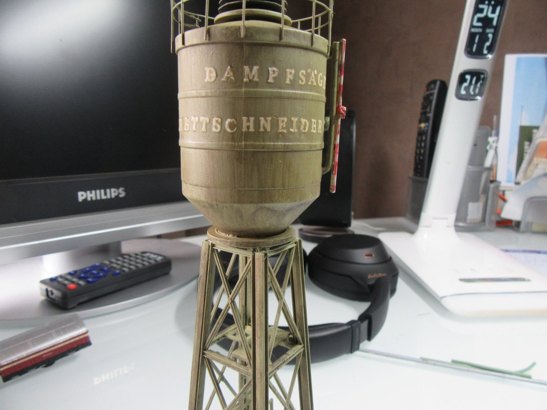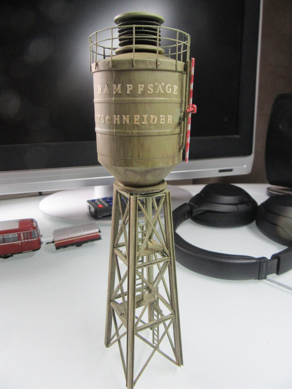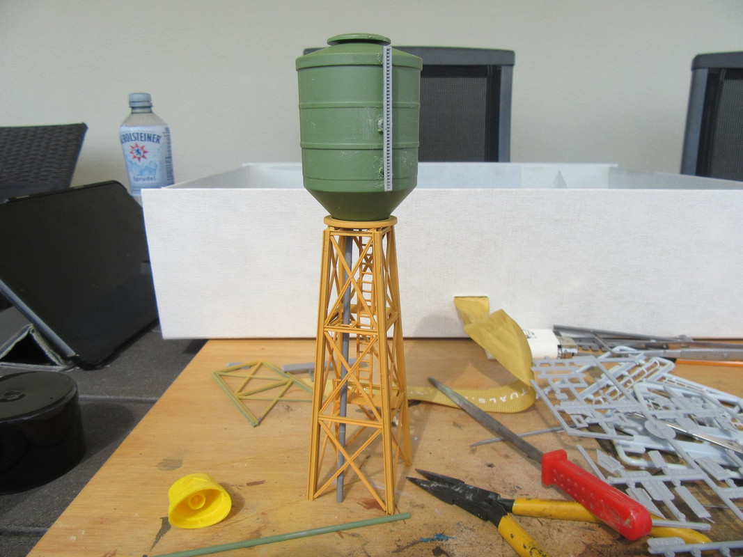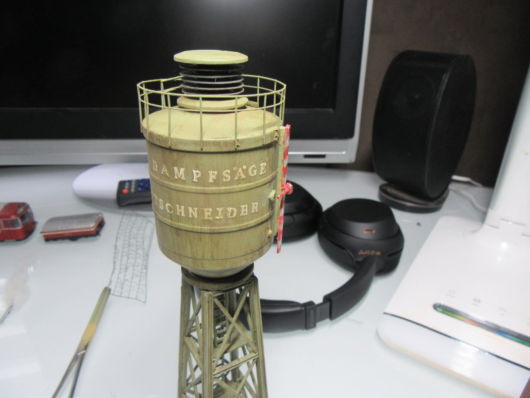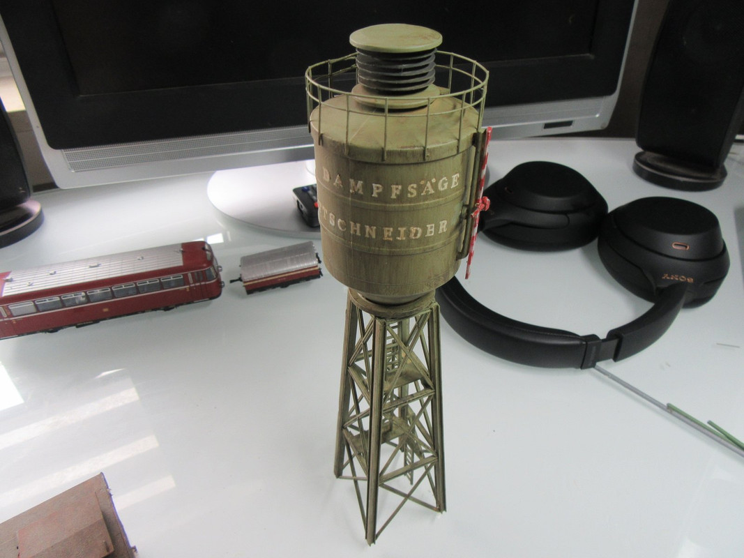 Das könnte man doch verwenden,dachte ich und so erhielt der Wasserturm eine Lackierung in RAL 6013 (Maschinengrün) und eine Alterung mit dem Farbkasten.
