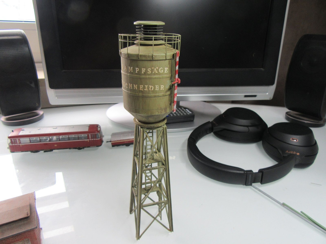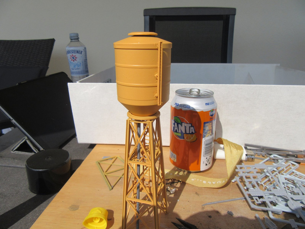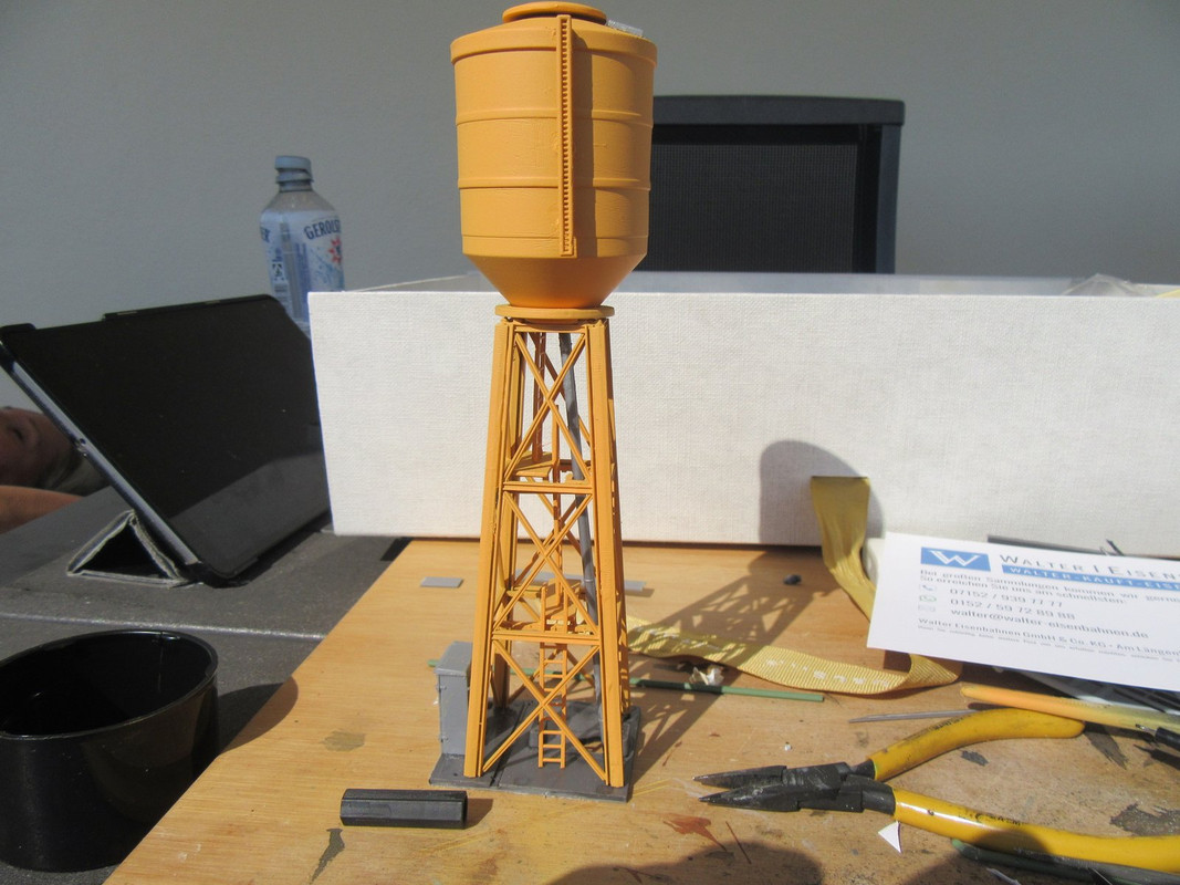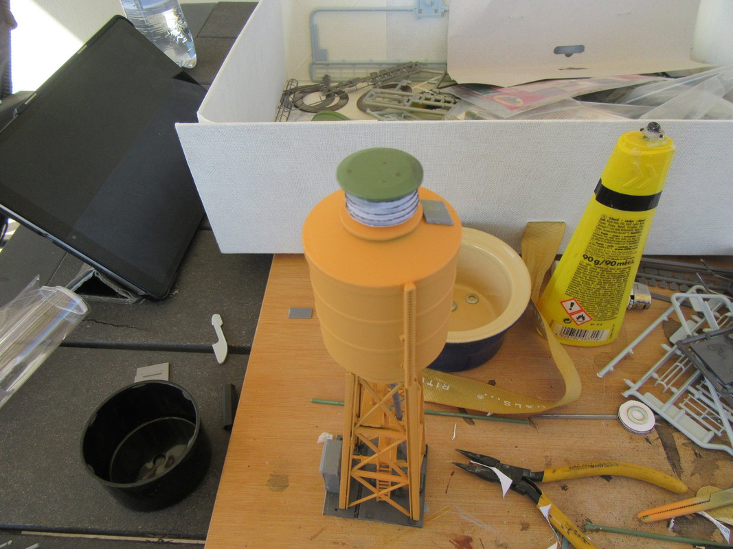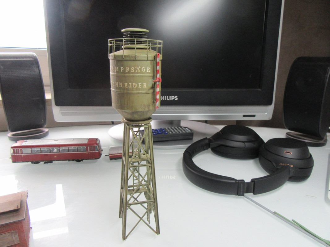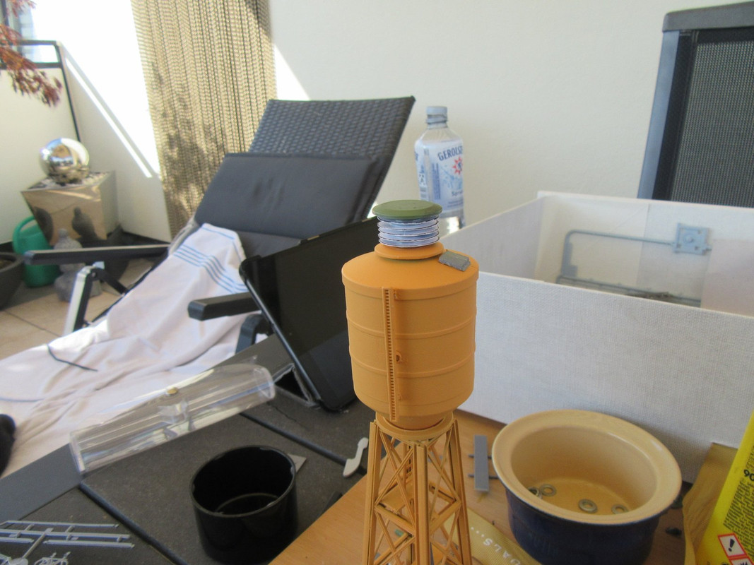 Das könnte man doch verwenden,dachte ich und so erhielt der Wasserturm eine Lackierung in RAL 6013 (Maschinengrün) und eine Alterung mit dem Farbkasten.