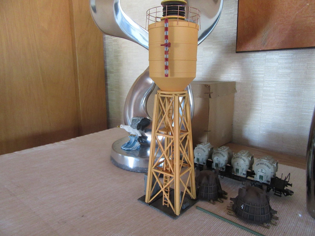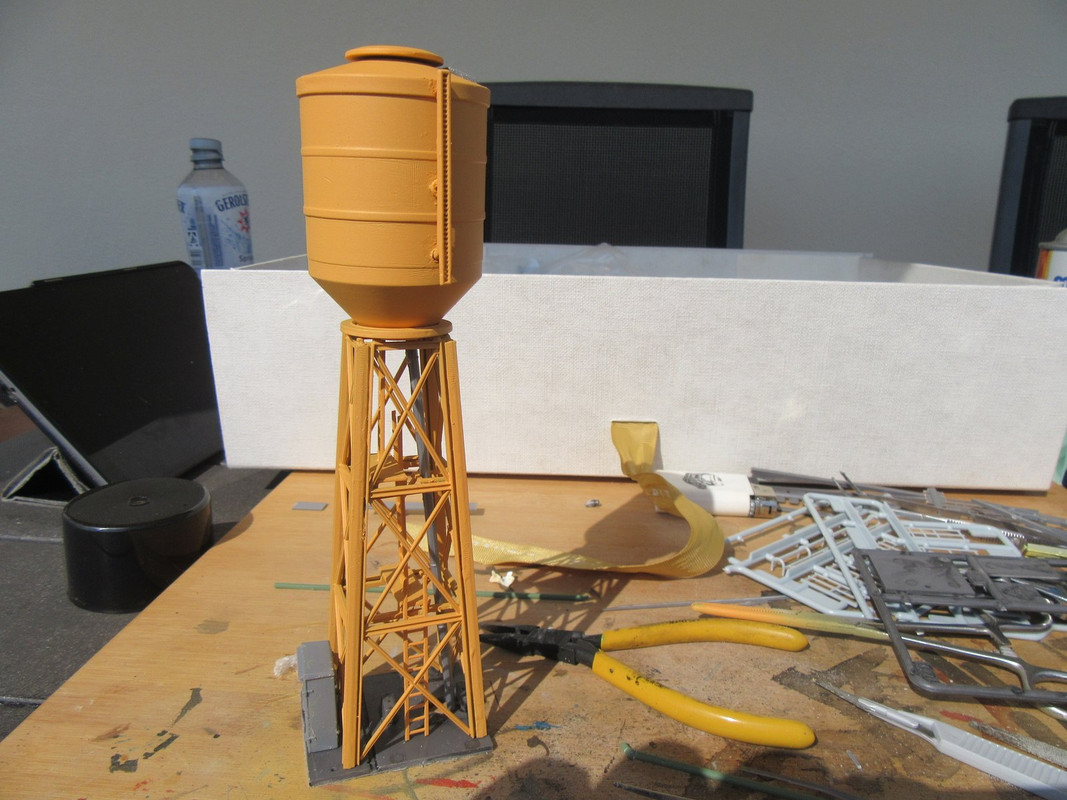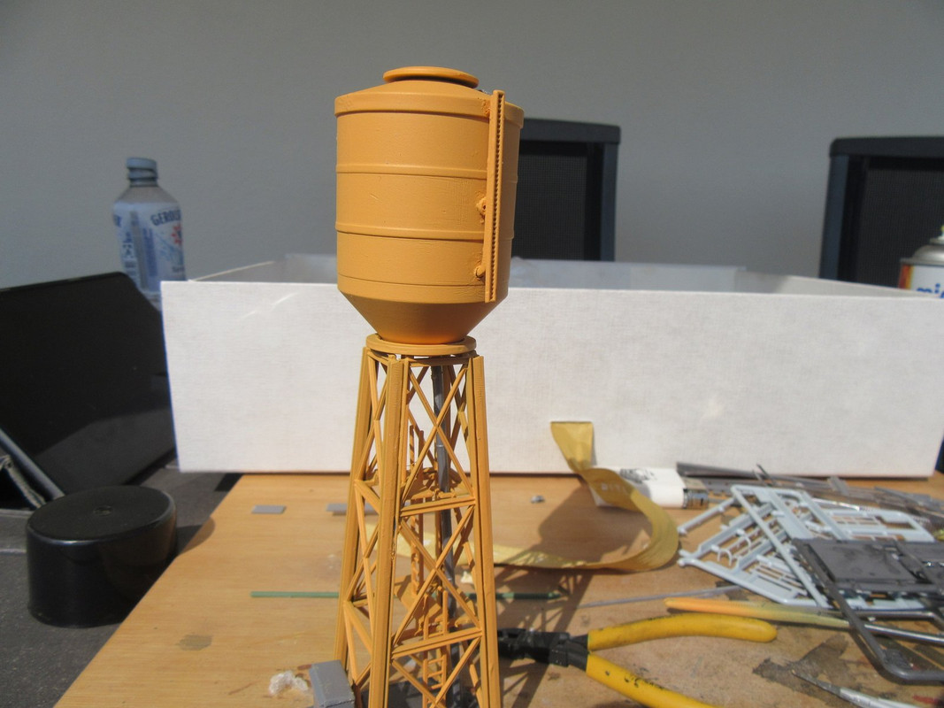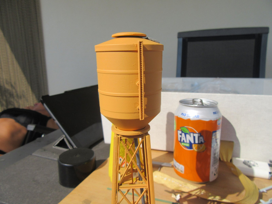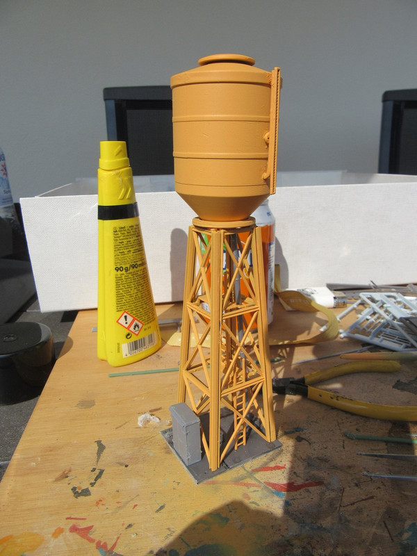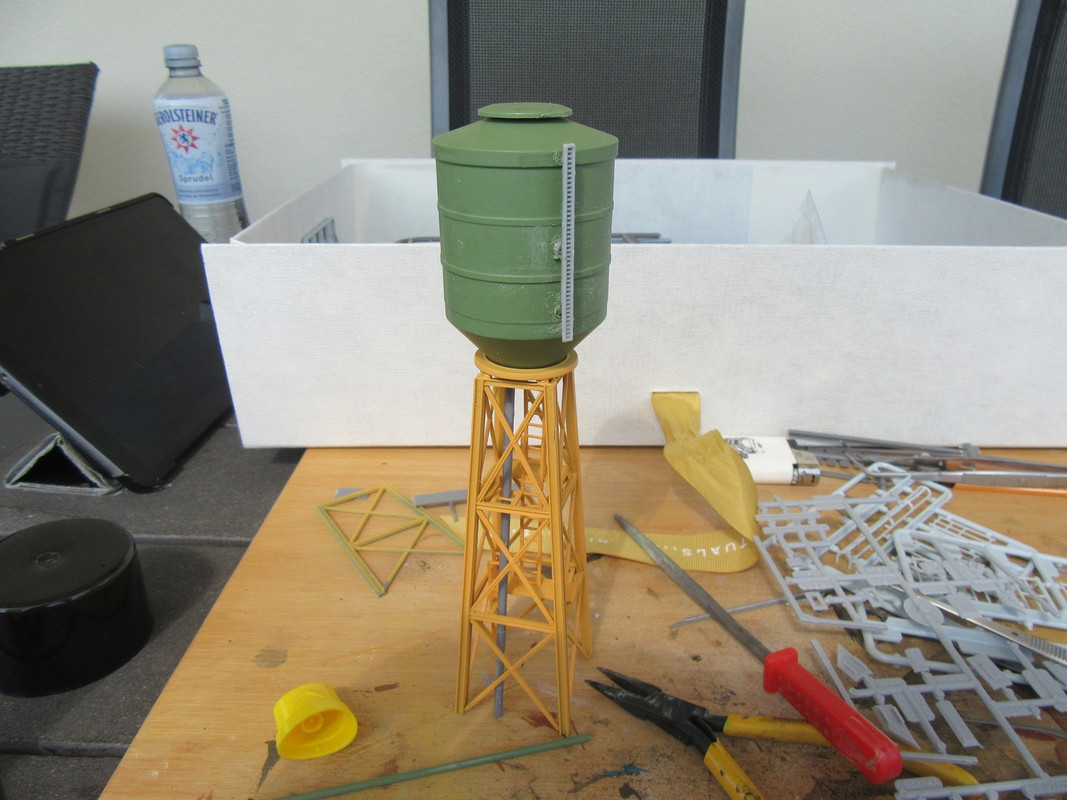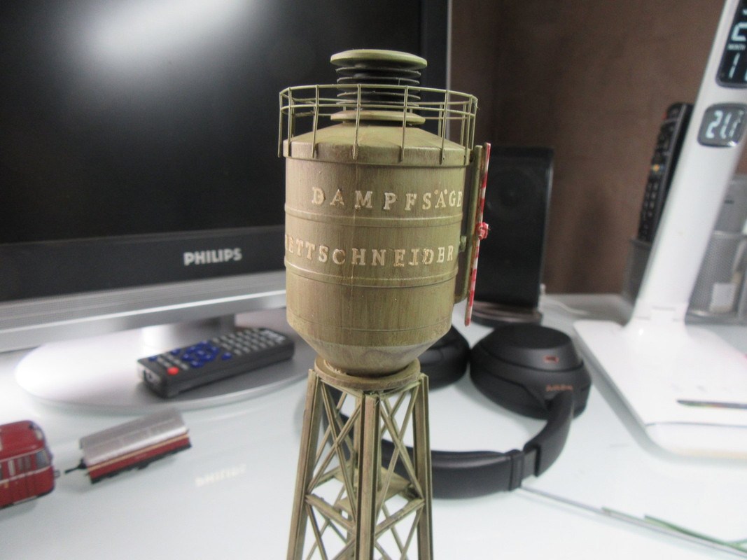 Das könnte man doch verwenden,dachte ich und so erhielt der Wasserturm eine Lackierung in RAL 6013 (Maschinengrün) und eine Alterung mit dem Farbkasten.