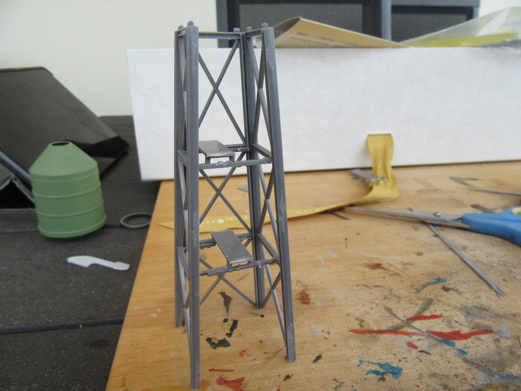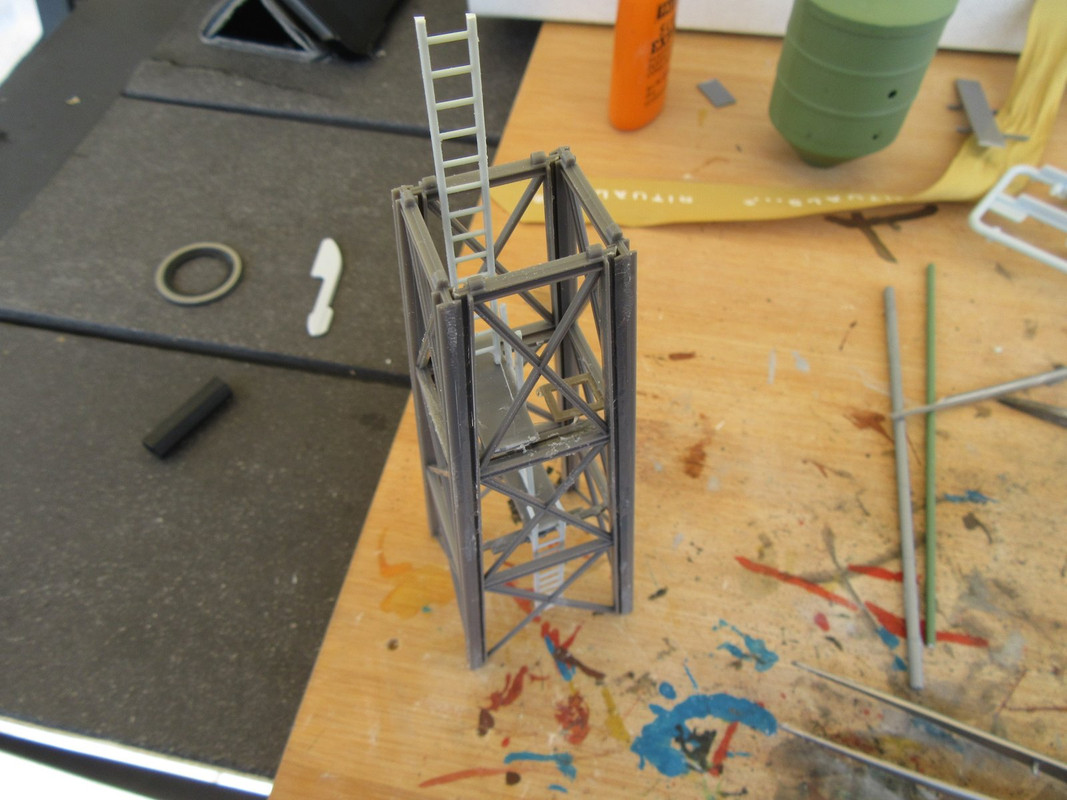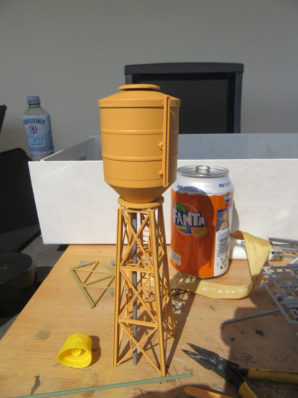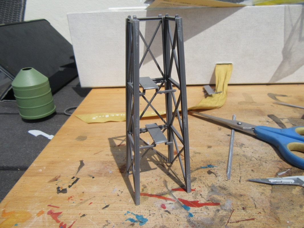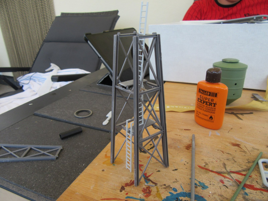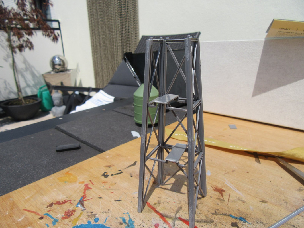 Aus den Standfüßen der Faller Förderbänder entstand der schmale Turm für einen Wasserbehälter.