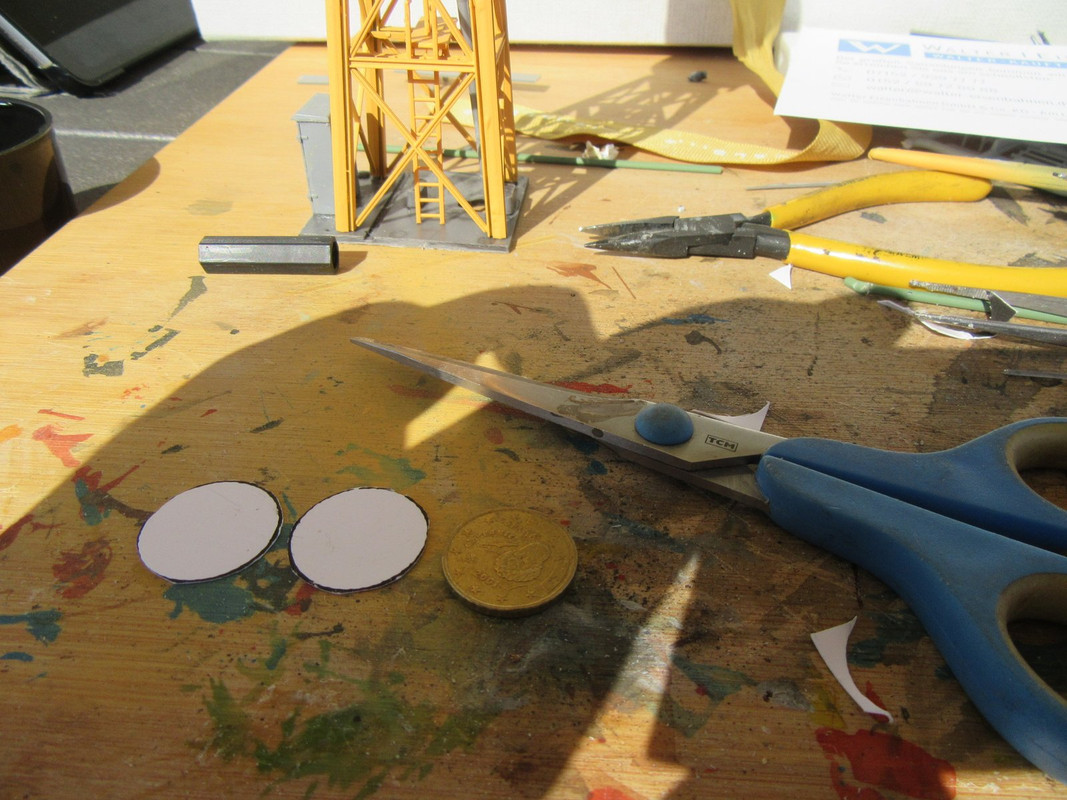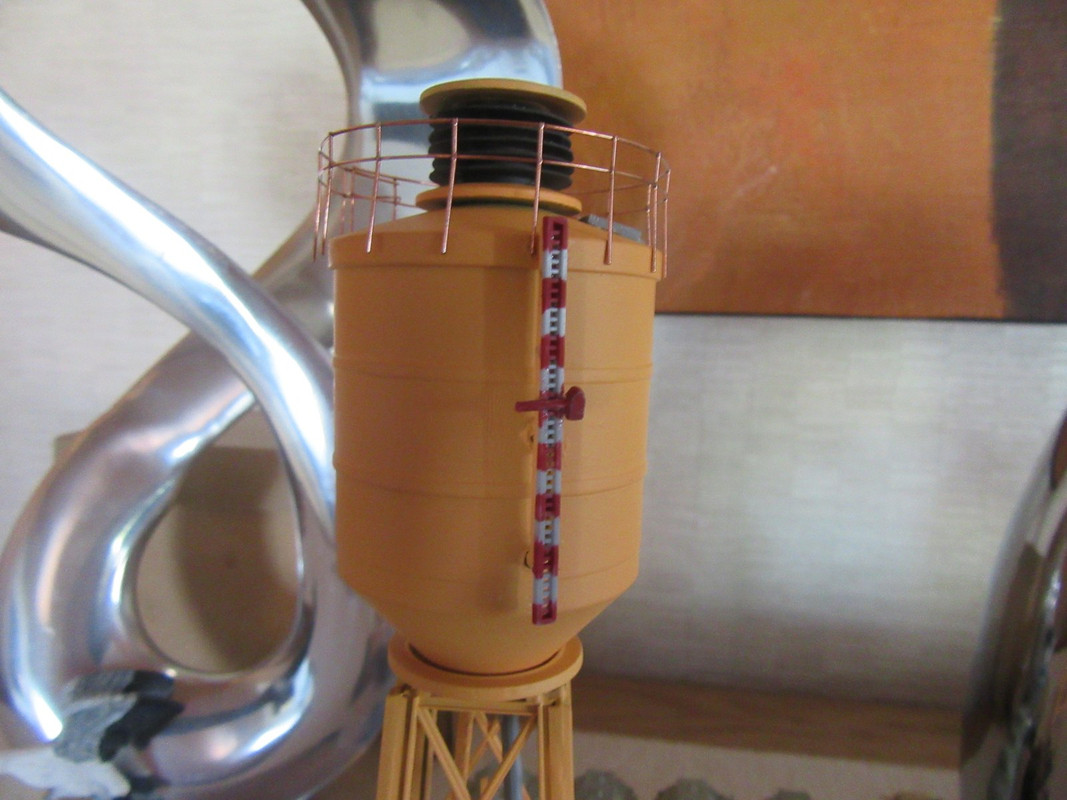 Der Tank war noch zweifach in der Bastelkiste und stammt vom Bau der „Südmühle“ und den dortigen Silos.Die Verbindung von Tank und Fuß erzeugte ein 18er Dichtungsring mit Gummilippe vom LKW.Wohl dem Bastler der ein MAN Lager sein eigen nennt