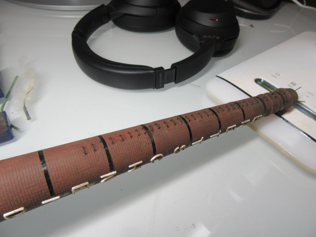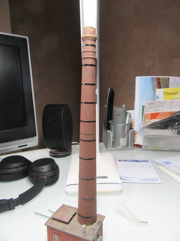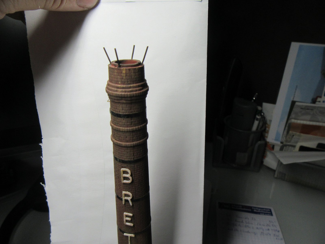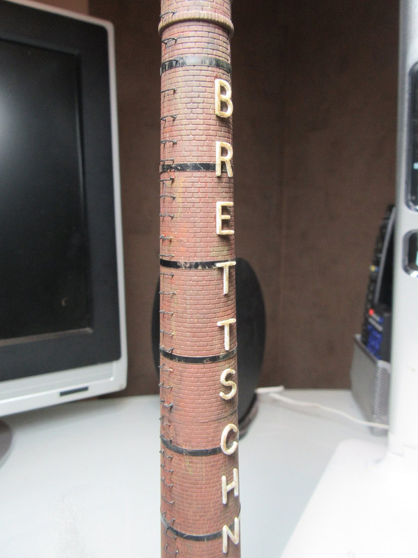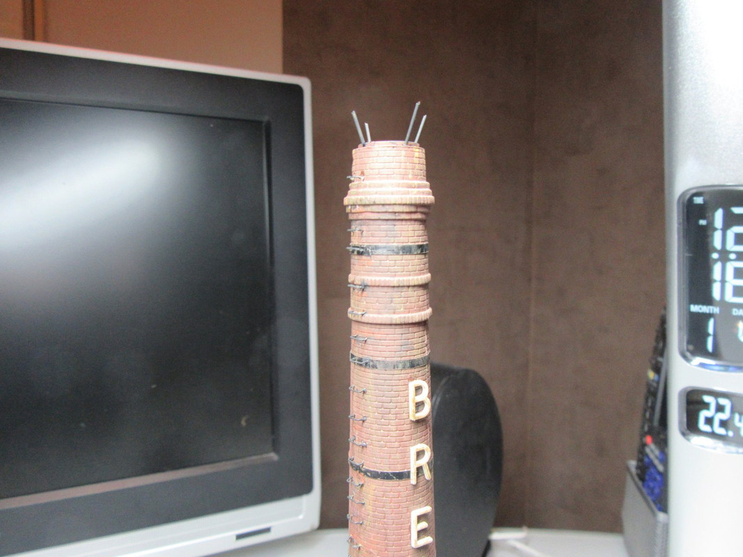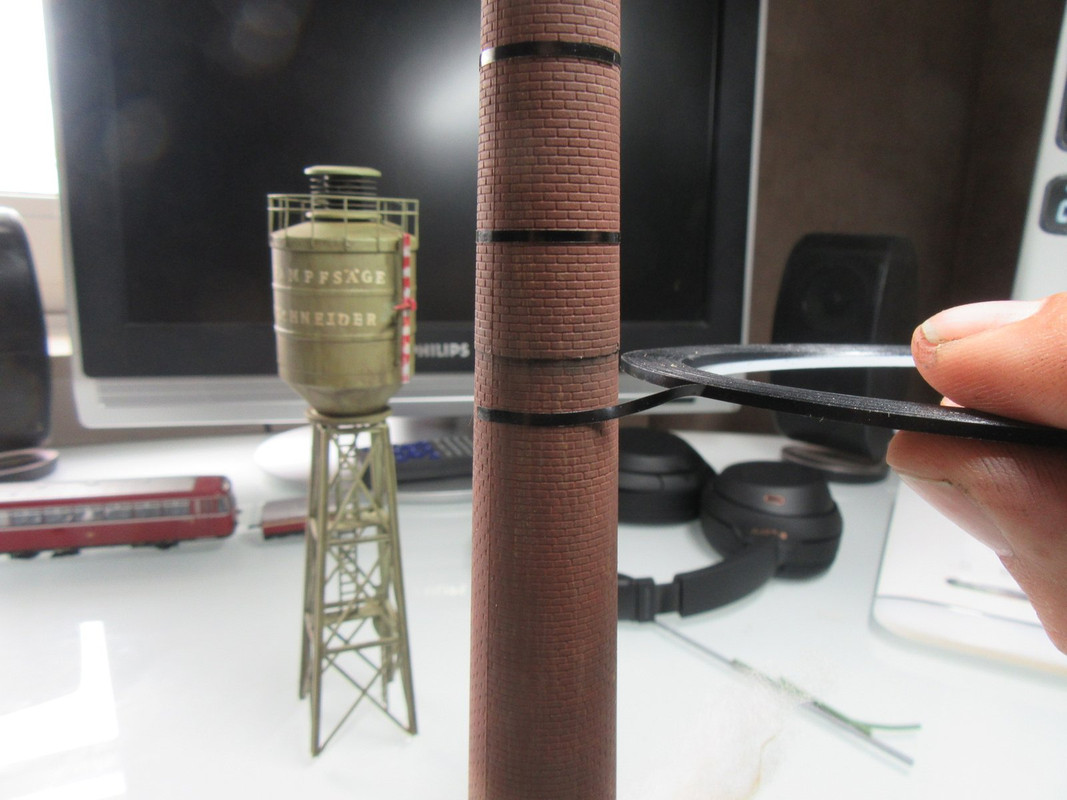 Mithilfe von 2mm breitem schwarzen Zierlinienband wurden dem Schornstein Spannbänder verpasst,die das Mauerwerk stabilisieren sollen. Aus dünnem Messingdraht erhielt der Schornstein 4 Blitzableiter.