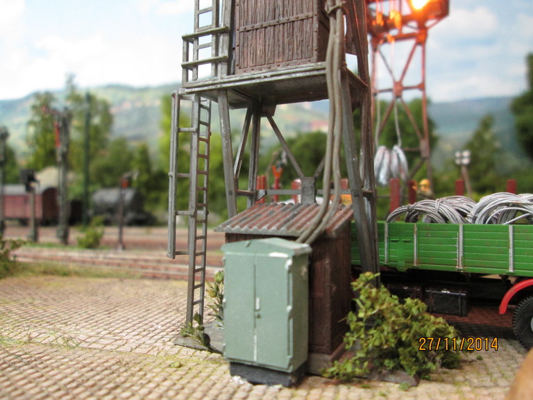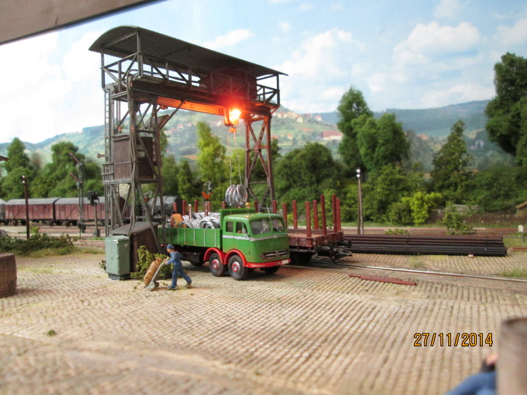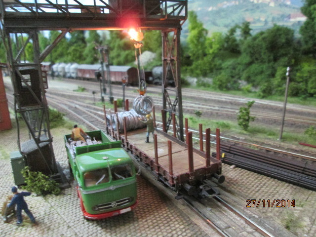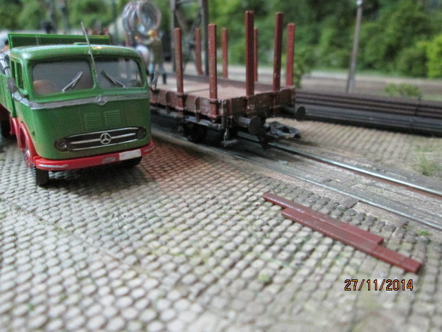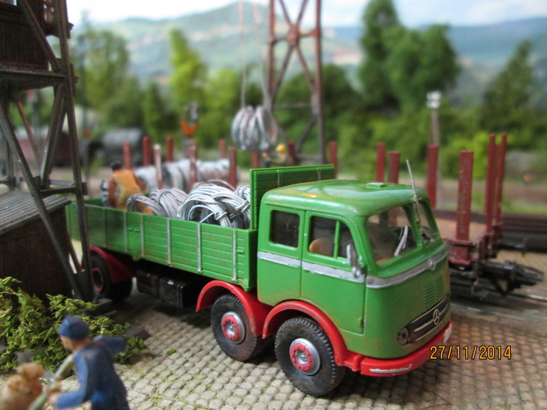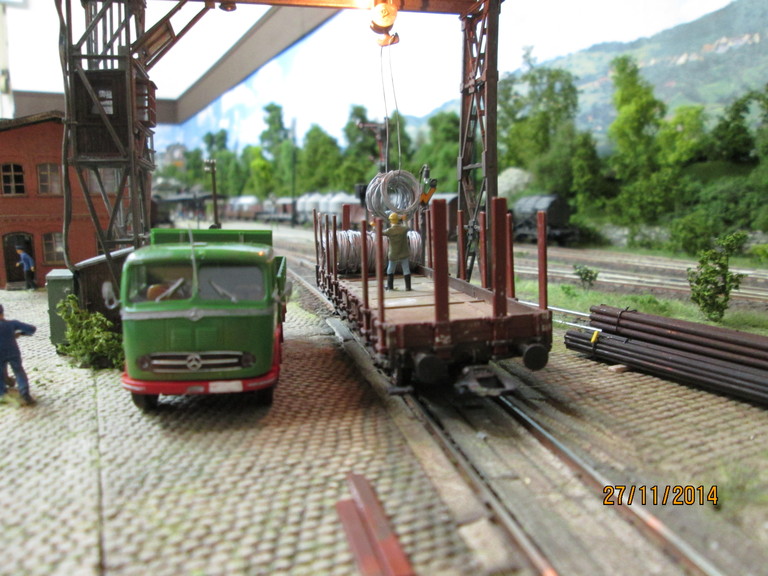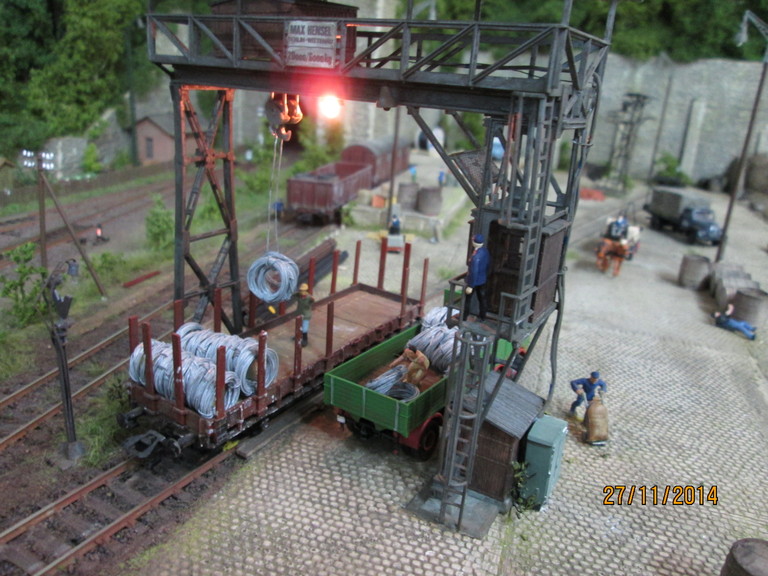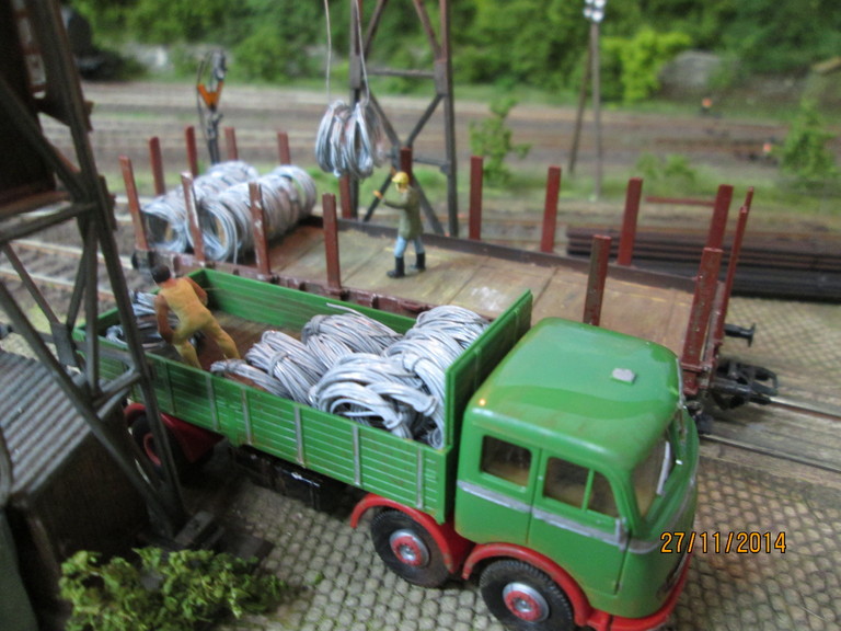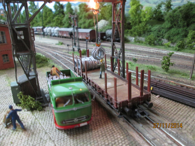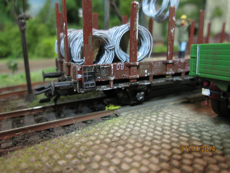 http://www.olafs-fotoseite.de/WWi001-Mer...iso-dkgruen.jpg das Modell wurde farblich aufgepimpt und ein wenig verschmutzt mit Pigmenten. Es bekam einen Lasercut-Holzboden von Joswood.Der Rest ist Farbkasten...und ein paar Weinert Kleinteile! Der Tausendfuß steht nun am Freiladebereich und "löscht"seine Ladung Drahtrollen auf einen R10. Es wird aber wohl noch eine Fuhre brauchen um den R10 voll zu kriegen. Guckst Du hier: