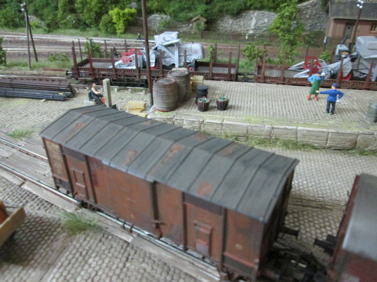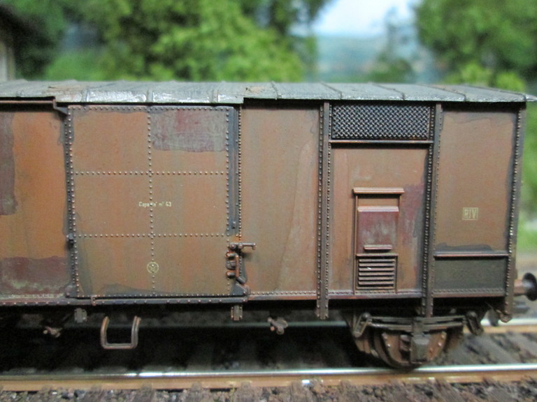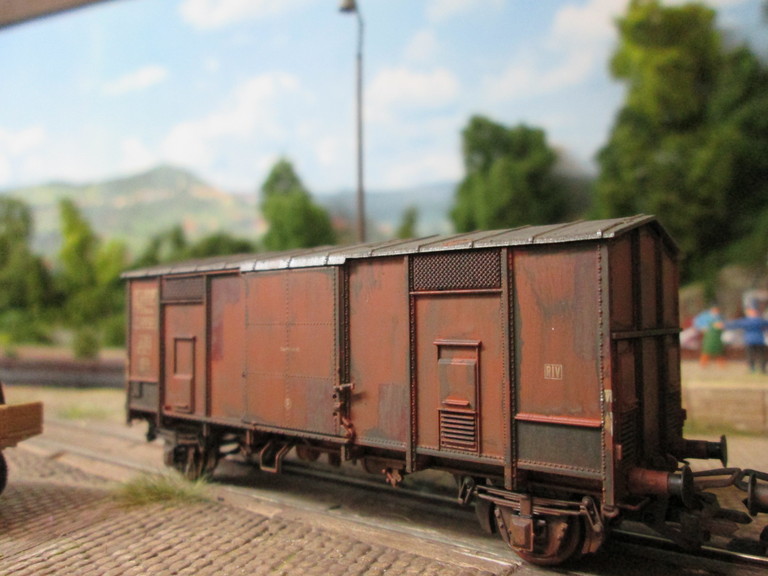 Zur Durchführung: Zunächst habe ich den Wagen zerlegt. Es folgten Lackierung des Daches und der Radsätze sowie des Fahrgestells mit der Airbrush und British Military Brown von Testors. Dem Wagenkasten wurden Ausbesserungsflicken mit Vallejo Rostbraun beigebracht. Die weiter Alterung wie immer mit dem Pelikan Farbkasten und verschiedenen Brauns bis Schwarz. Das Metallspitzdach wurde nach Trocknung mit Haarspray behandelt. Wiederum nach Trocknung wurde Lava.Grau von Anita Decor aufgebracht. Nach erneuter Trocknung wurden Abplatzungen im Dachbereich mit einem Zahnstocher vorsichtig herausgekratzt,wodurch die darunter liegende Rostlackierung sichtbar machte. Ich hoffe es gefällt,wünsche Euch einen schönen Advent,hoffe Euren Damen haben auch schön die Kerze angemacht heute Morgen ,sage Grüße und bis später Willi...Der Dampfer 8)