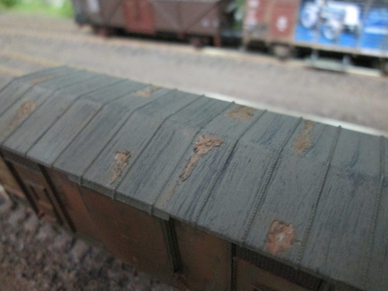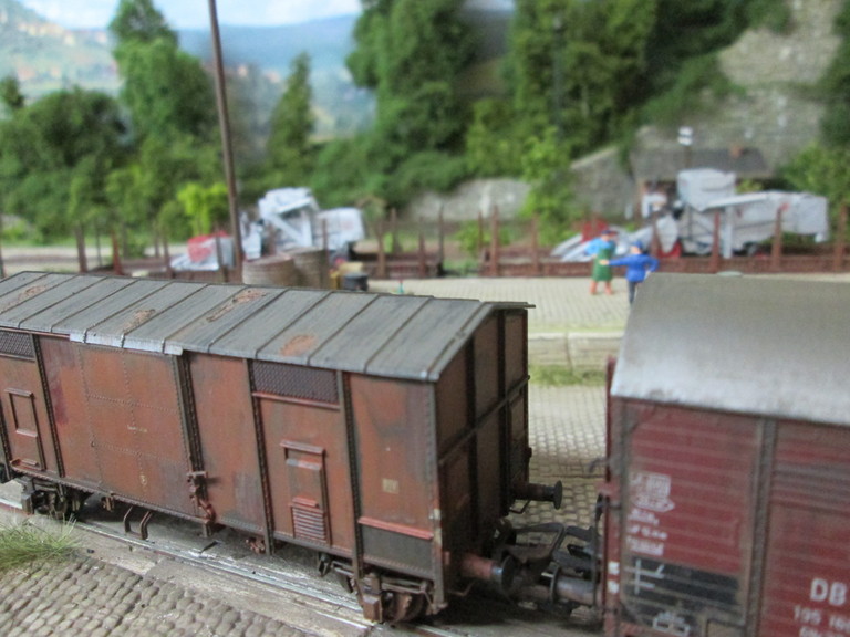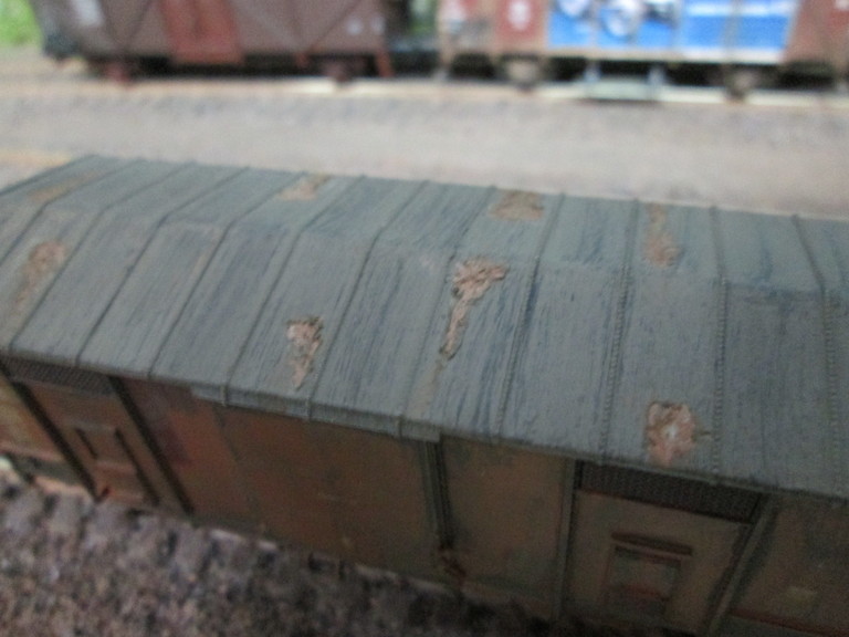 Danke für Dein Lob mein Stummifreund. Habe soeben nach Deinem Bericht noch 4 Bilder der anderen Wagenseite nachgelegt(hatte ich vergessen sorry,sowie ein weiteres Bild des Daches,ich hoffe man erkennt die Abplatzungen besser). Lavagrau ist ein dickflüssige Acrylfarbe wasserverdünnbar. Stark verdünnt nimmst Du sie als Lasur z. B. für Gips siehe Pflasterflächen in Neustadt/Güterbahnhof. Pur kannst Du sie auch verstreichen. Ist dann recht dick und war hier beim Waggon schön um nachher abgekratzt werden zu können. Die darunterliegende Rostschicht liegt dann etwas "tiefer" so als habe die Korrosion schon ein"Loch" in die Wagendecke gefressen und gleichsam das Blech dünne gemacht. Beste Grüße und gerne bis später sagt Willi
