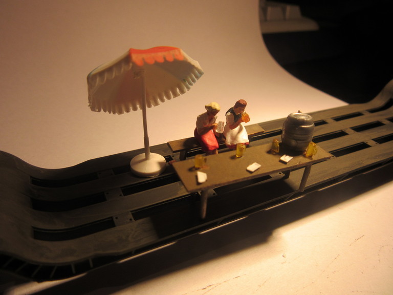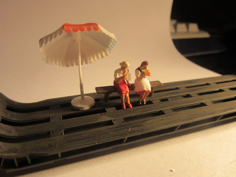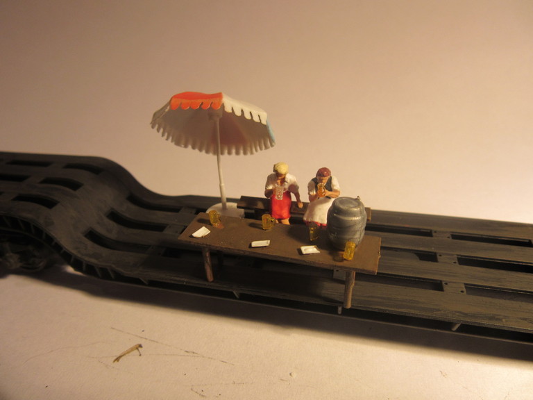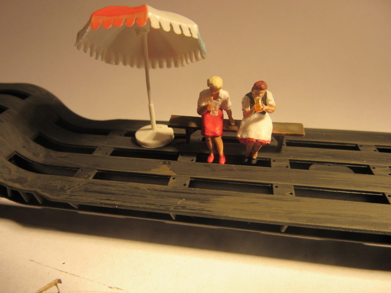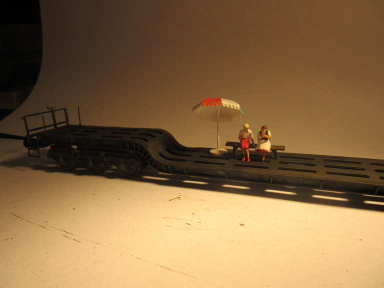 Ich meine ich baue sowohl Klamotten für den Biergarten des grünen Huhns als auch arbeite ich am Trafowagen zur Vollendung der Ladeszene mit dem dicken MAN Motor. Da bastele ich nun so vor mich hin ,im Hintergrund läuft ein wenig Musik da fällt mir plötzlich aber und abermals ein leichtes Geplärre auf. So... Frauengeplärre...kennt Ihr ja sicher. Und Tatsache, da sind doch zwei resolute Damen (Preiserfiguren die ich zur Sitzprobe mit an den Arbeitstisch genommen hatte) vorstellig geworden und baten recht frech darum,ob ich denn mal nichts zu trinken anbieten würde. Und wo man sich hier aufhalten müsse ,wäre unter aller Sau; in einer Plastikschale. Da es sich mindestens um eine gutaussehende Blonde handelte bat ich die Damen als alter Kavalier im wärmenden Licht der Arbeitslampe Platz zu nehmen und servierte dann auch nach und nach was zu trinken. Ich bat die Damen doch auf dem Tiefbett des Trafowagens zu sitzen. (Schließlich bin ich 20 Jahre verheiratet und geübt darin den Zorn einer Dame sogleich katzenfreundlich auszubremsen und in ein atraktives Sitzplatzangebot umzulenken. Dann war endlich Ruhe und die zwei Schönen genossen ihr Getränk,sahen mir bei den restlichen Arbeiten zu und von einem gelegentlichen Geschnatter abgesehen,war nichts mehr zu hören. "Sachen gibt´s!!!!!!!!!!!" Guckst Du hier:
