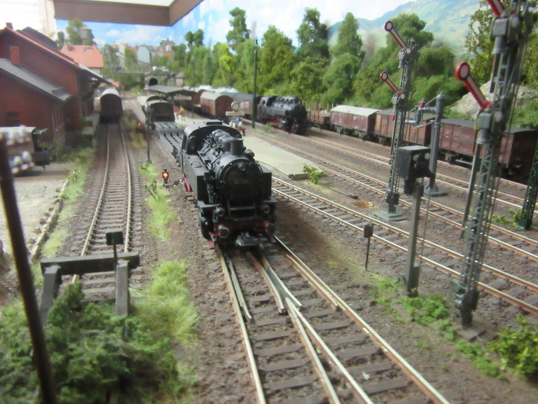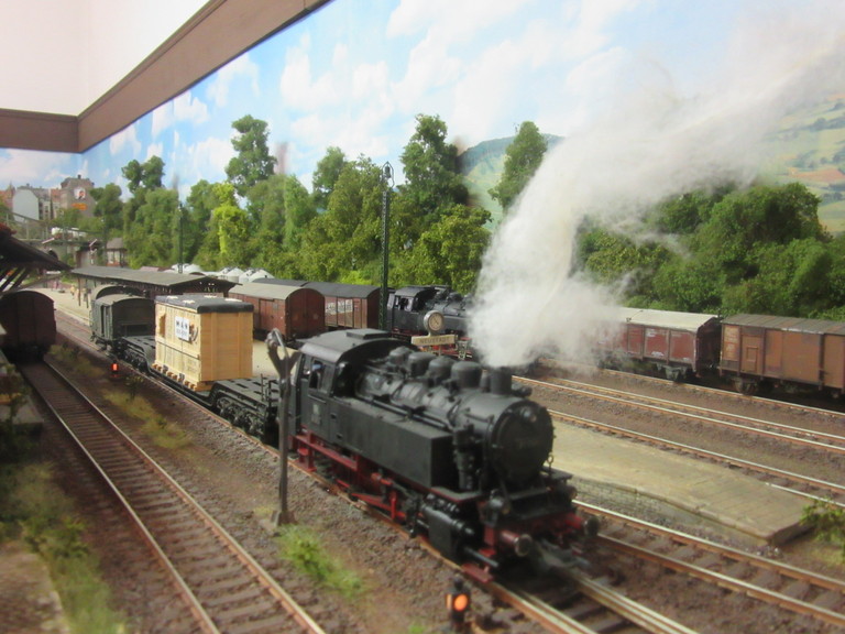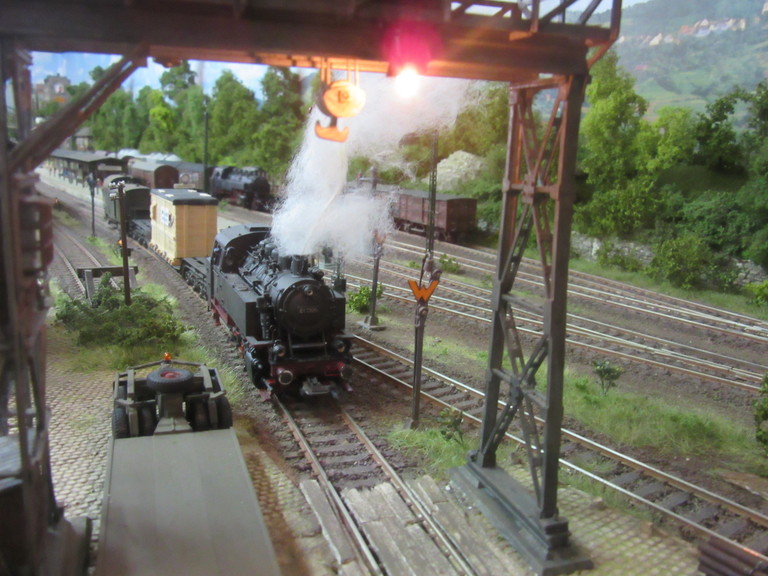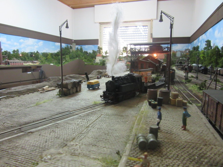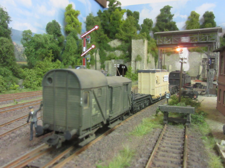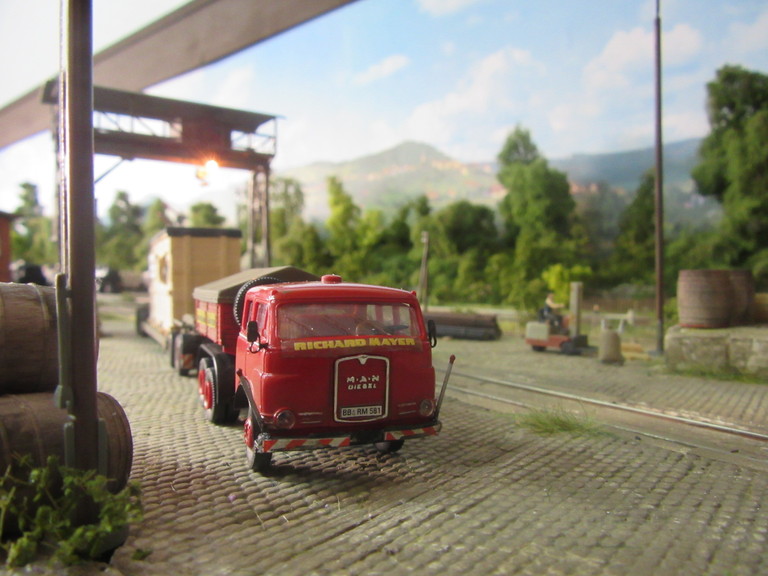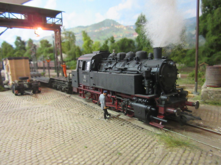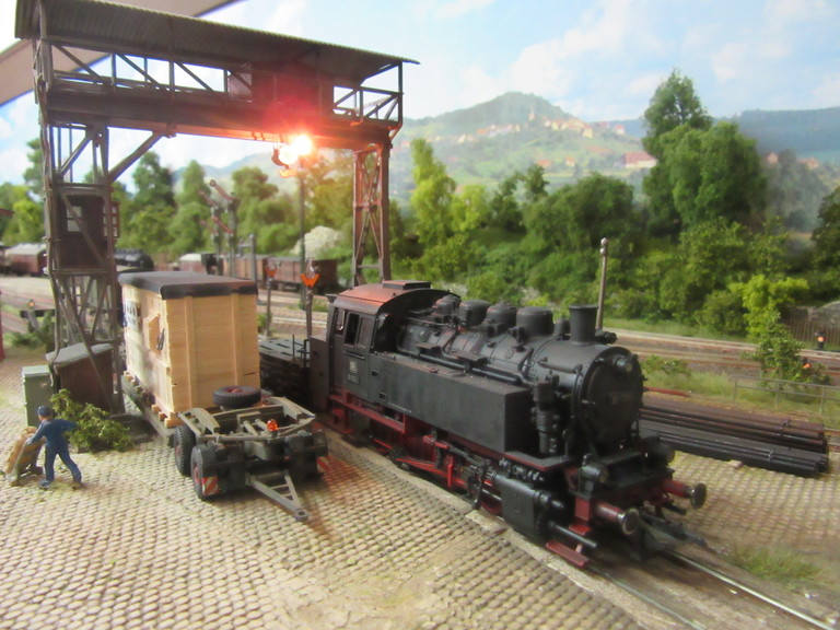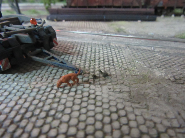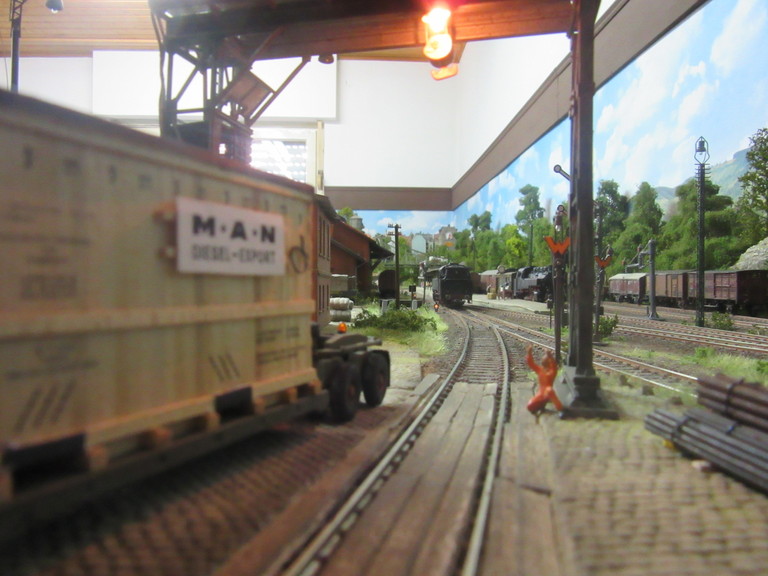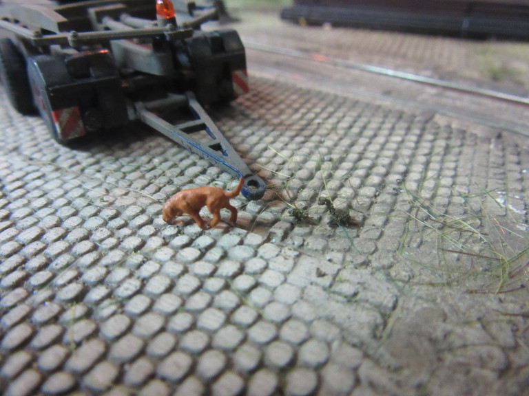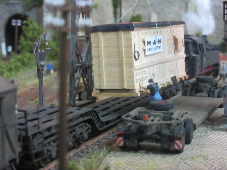 PS: Kaum war das Ladegeschäft um den Motor beendet und Ruhe war eingetreten im GBF da nutzte auch schon Fifi ,der Hund des GBF Vorstehers die Gunst der Stunde und verrichtete sein "Geschäft" nach etwas schnüffeln just vor der Anhängerschere des Scheuerle Tiefladers,den der Fahrer in den nächsten Minuten anhängen will,um nach Hause zu fahren. "So eine Schweinerei!!!.....habe ich ihn noch beim Verlassen des Eisenbahnzimmers brüllen hören,als er kurz zuvor mitten reingetreten war...in die Scheiß......äh Schweinerei!