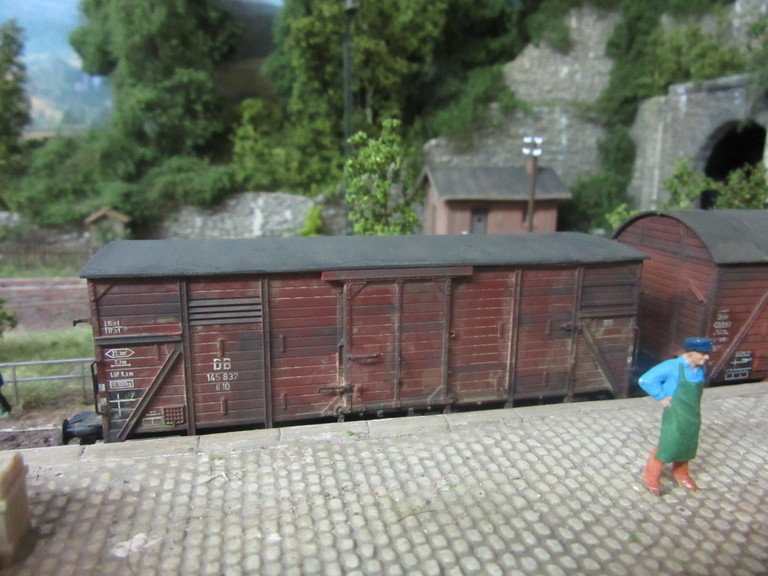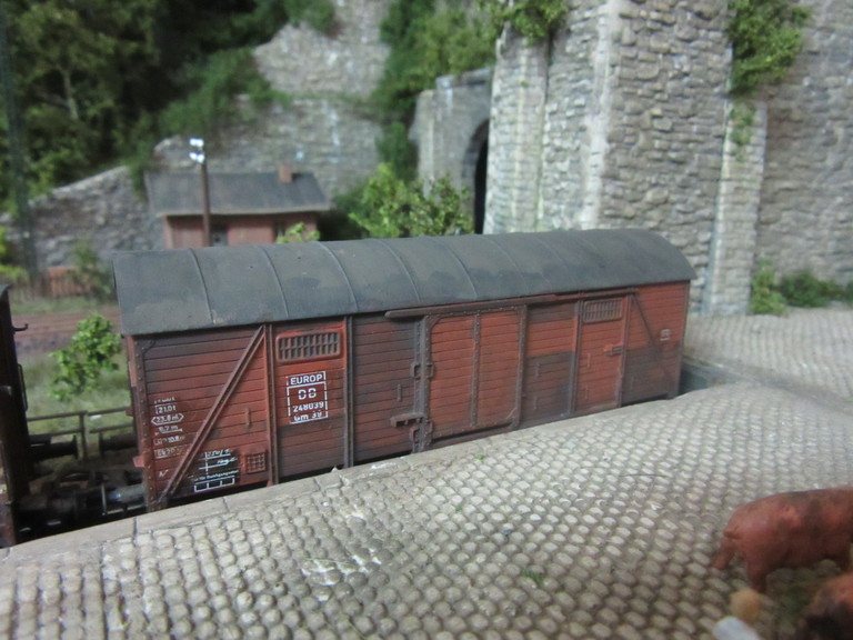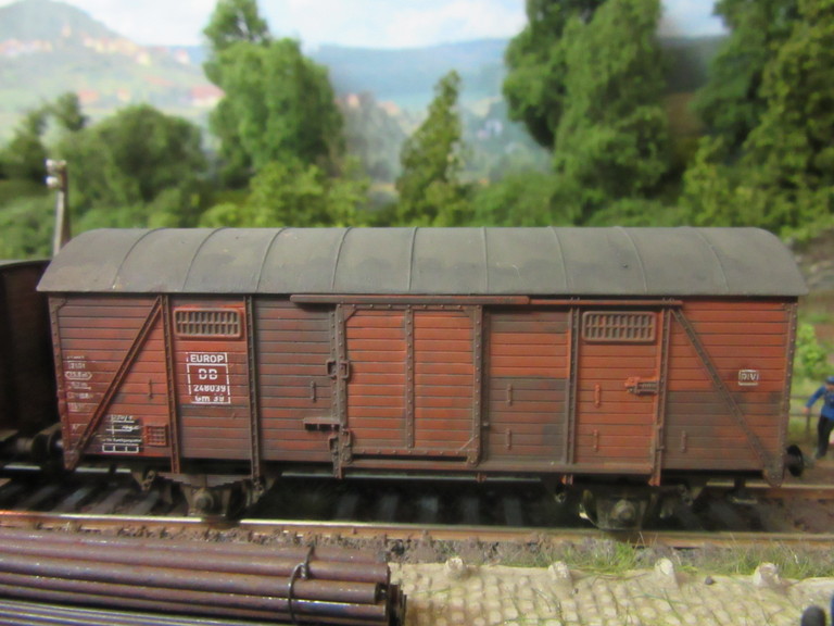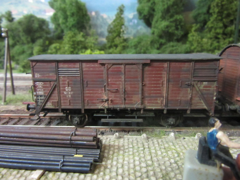 hier nochmals zwei Wagen aus der" Schminkerei" (habe ich von Indusi Andi,hört sich besser an als altern,meint er) diesmal wieder in "Verschossenem Güterwagenbraun aber mit Flicken und Co.(der Runddachwagen) und ein alter G10 mit allerei Ausbesserungsstellen: