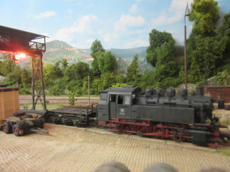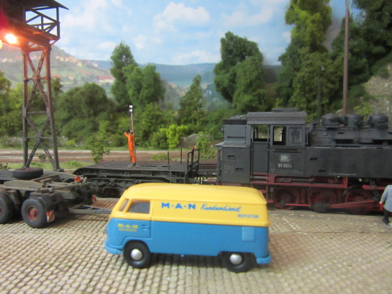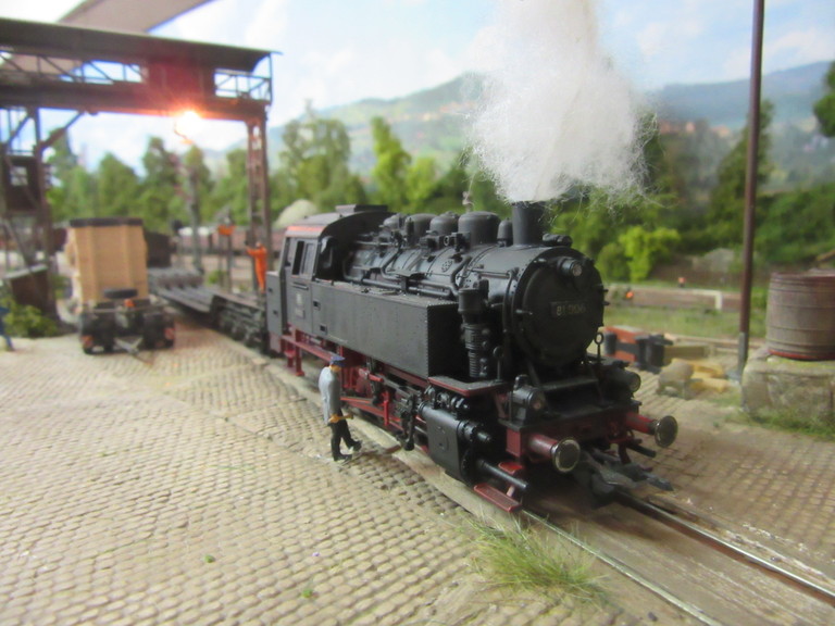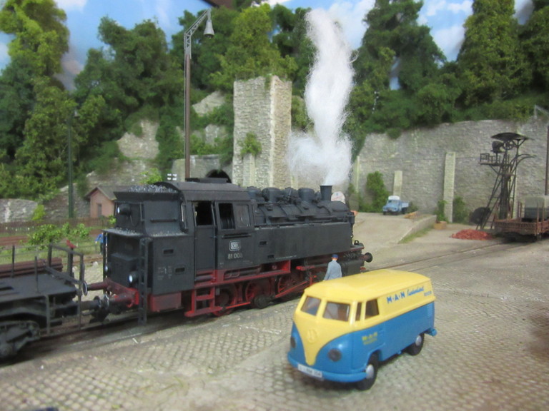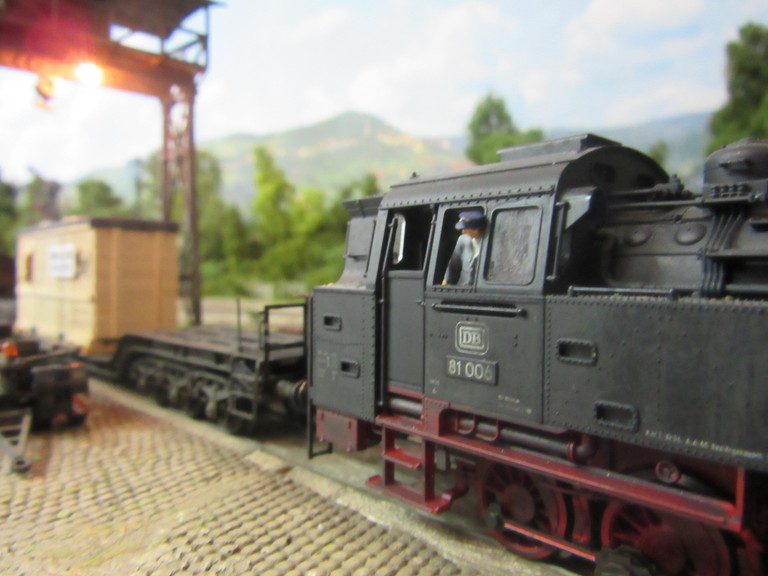 nachdem die Fuhre richtig steht hängt der MAN Dreiachser ab und zieht vor,zur Seite. Schon naht durch Pfiff angekündigt die Rangierabteilung mit der schweren ,uns schon bekannten 81er (Meister Kuhn hat heute die Ehre ) und rollt mit geschlossenem Regler heran.