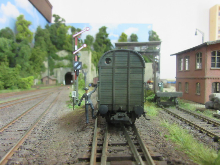 selbstverständlich ist der erste Wagen ,der Begleitwagen, mit einem Rangierer ,hier Karl Rosig, besetzt. Die Pfeife am Mann, geht es zurück in den Bahnhof.