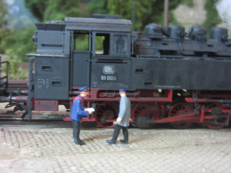 kaum zum Sillstand gekommen springt Kuhn von der Lok und hält Nachschau. Da er eh warten muß auf die Beladung mit dem Motor,nutzt er die Zeit um seine Maschine zu pflegen