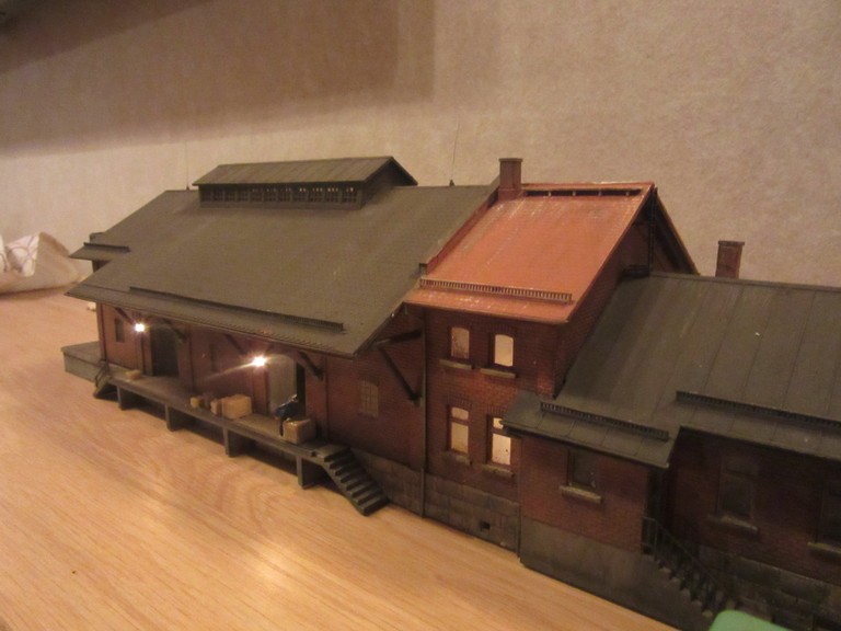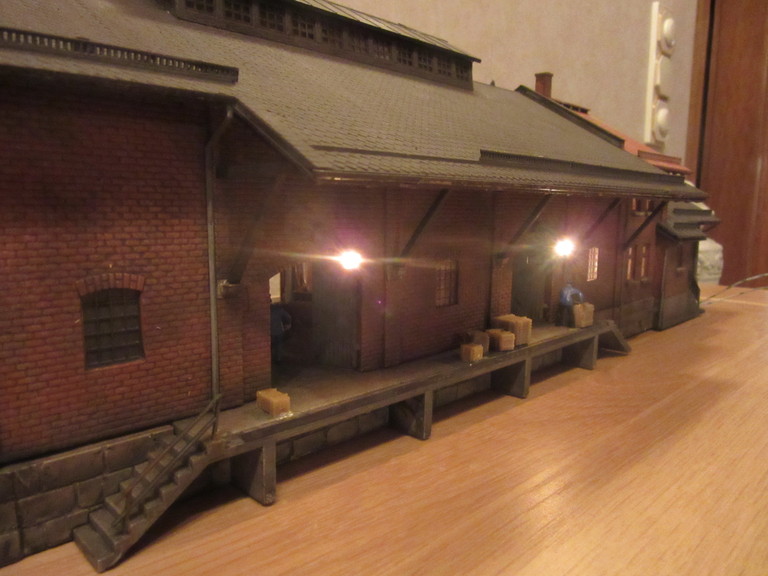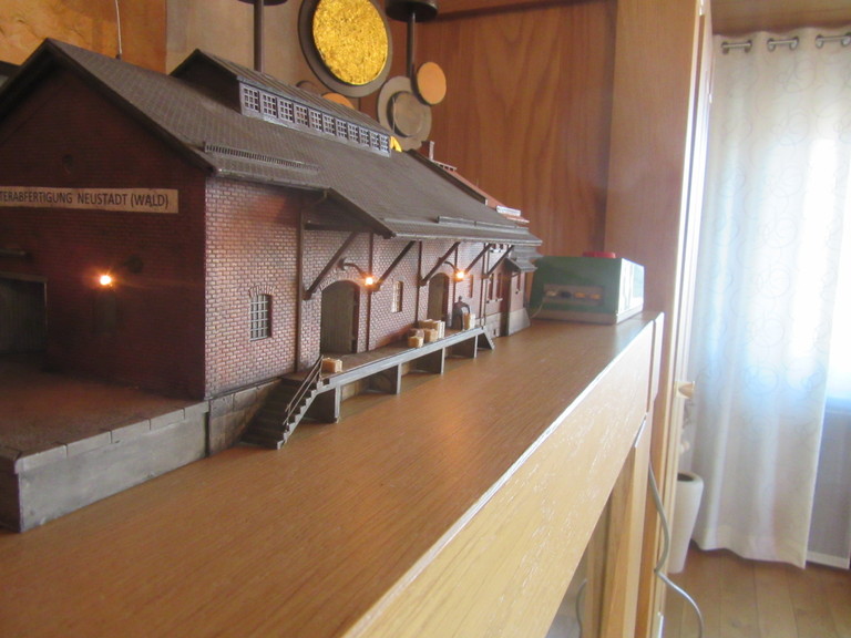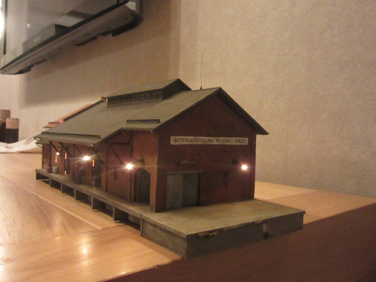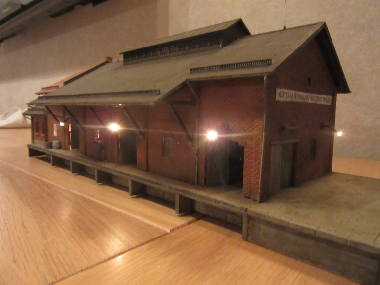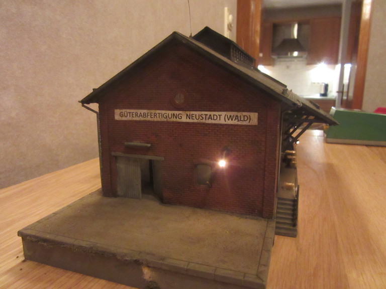 Hallo Stummis Kurze Info über die Arbeiten an der Güterabfertigung Neustadt / Wald Habe gestern und heute den Schuppen "abgebrochen" .....nein,nein......vorsichtig abgehoben und mit in meine Gemächer genommen. Da meine Holde heute mit anderen Hühnern im Kino weilt.....ja fifty shades of grey konnte ich in Ruhe meinen Schuppen bearbeiten. Die Außenlichtattrappen wurden entfernt und durch feine Viessmann N Spur Wandleuchten ersetzt. Der Schuppen erhielt neue Blitzableiter und ein wenig Ladegut im Innen- Bereich im Sichtfeld der Türen. Eine vollständige Inneneinrichtung ist nicht mehr möglich,da der Schuppen dazu gewaltsam geöffnet werden müsste. Für das innere Ladgut habe ich ältere Noch Artikel aus Kunststoff verwendet. Die Aussenbereiche werden dann mit Kotol und Paulo Sachen bestückt. Als nächstes wird der Schuppen nun endgültig aufgesetzt und das Umfeld (Grün etc.) gestaltet,bevor dann das zweite Ladebahnsteigdach aufgesetzt werden kann. Doch davon später. Der Schuppen hat jedenfalls schon "die Fackeln am leuchten" (niederrh. für betrunken ) und hat mir heute Abend im Wohnzimmer Gesellschaft geleistet. Guckst Du hier: