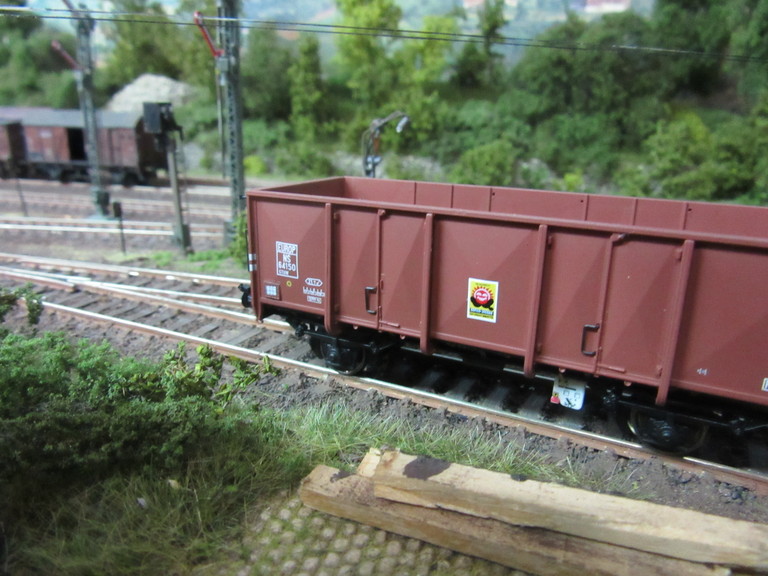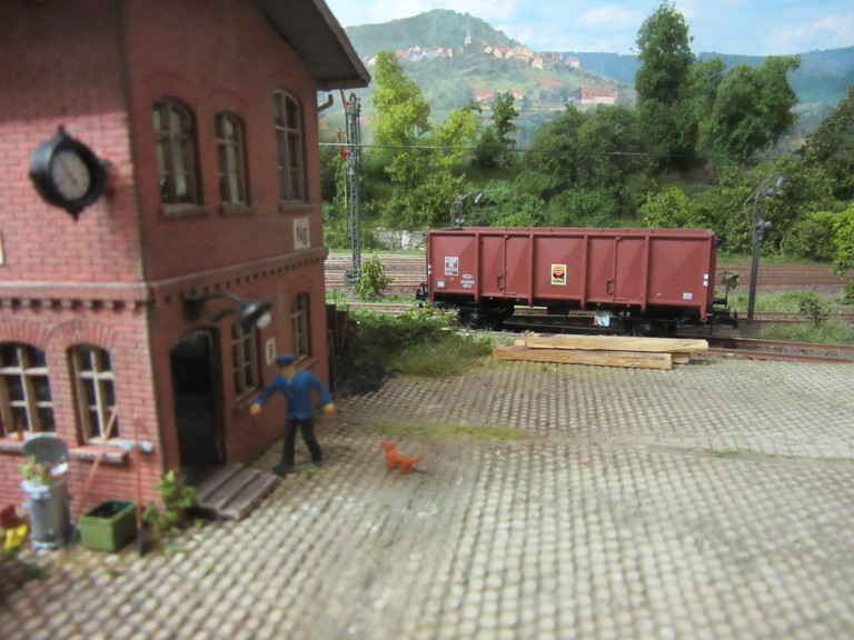 Werner scheint heute nach dem Rundgang in "seinem" Güterbahnhof nicht wieder rein zu wollen. Im Hintergrund erblicken wir ein Beutestück der Dortmunder Messe. Diesen niederländischen( Artitec) Kohlewagen (auch mit innen geprägten Wänden und Türen) konnte ich nicht stehen lassen.