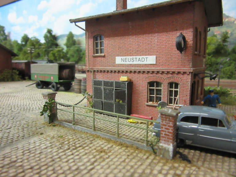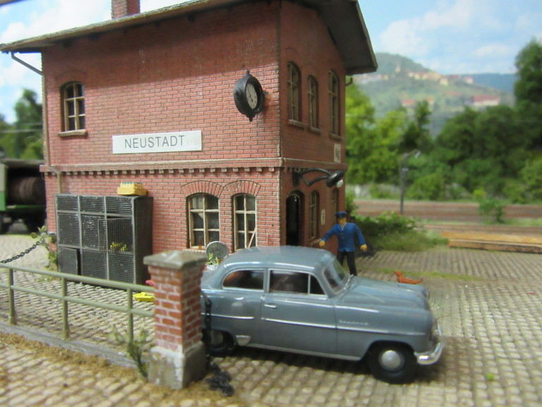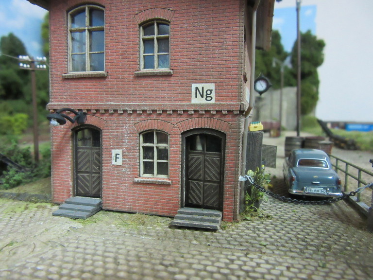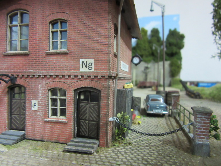 Hier hat er den Opel mal etwas versetzt...was die völlig überfüllte Mülltonne des Vorfotos verdeckt und den Schrank für die Hemmschuhe und Zugschlußsignale freigibt. Die Kette ist von KMD /0,3mm Gliedstärke,das war ein Gefummel
