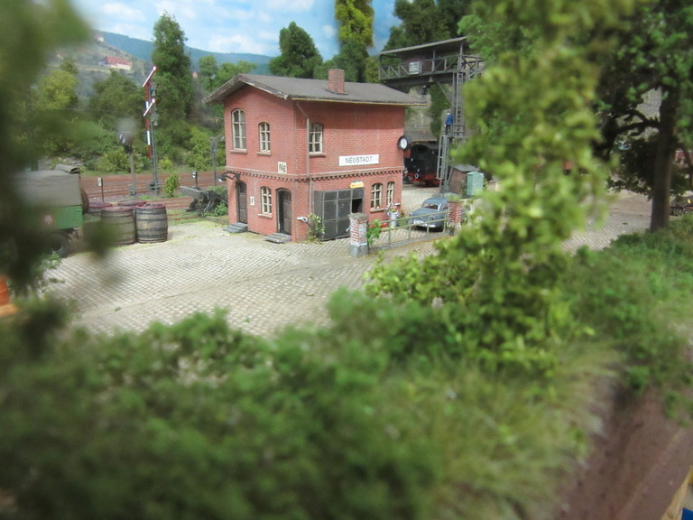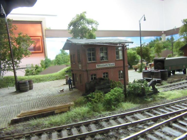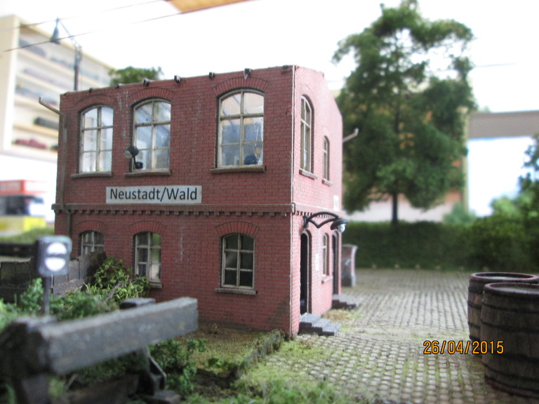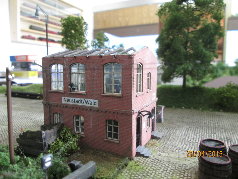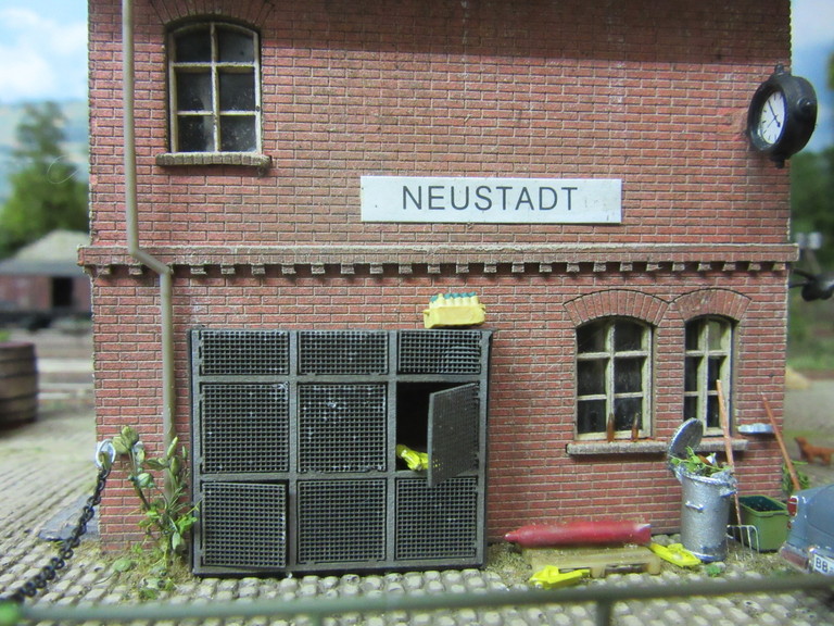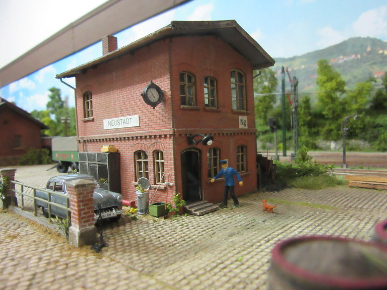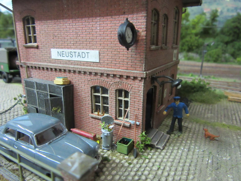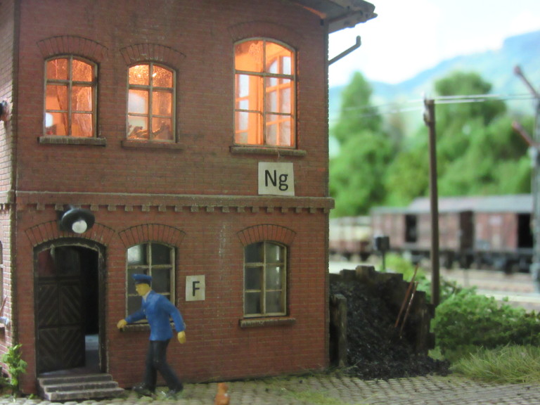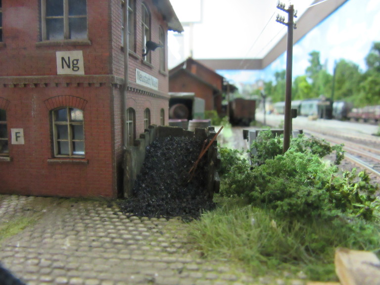 Hallo Stummis , Neues aus Neustadt Im Rahmen der Arbeiten an der Bahnhofstrasse ist die Bastel- und Baukolonne nunmehr am kleinen Stellwerk Neustadt Güterbahnhof /Ng angekommen. Nach Nachfrage beim Profi (Bauzugfahrer Andreas) könnte dieses Stellwerk so heißen. Möglich wäre auch Neustadt Güterbahnhof Weichenwärter Ngw. Dieses Kurzzeichen sieht aber „schei....e“ aus und somit habe ich mich für Neustadt Güterbahnhof Ng entschieden. Das Gebäude dürfte Euch ja bekannt sein,es gammelte schon auf manchen Fotos vom Freiladebereich mit rum. Es ist ein gebraucht gekauftes Joswood oder Moebo Häuschen. Natürlich mußte hier noch eine endgültige Bearbeitung erfolgen. So habe ich dem kleinen Posten zunächst mal eine Inneneinrichtung verpaßt. Dabei habe ich es aber nicht zu weit getrieben,da ja davon später nicht mehr so viel zu sehen sein wird. Ich hoffe es gefällt dennoch. Als nächstes wurden dem Gebäude Dachrinnen und Ablaufrohre angebaut. Auf den Fotos liegt das Dach manchmal noch etwas lose auf,wegen der Innenfotos! Sobald das Dach geklebt ist ,ist es gerade und die Ablaufrohre passen. Im Außenbereich wurde ein kleiner „Hof“ angegliedert. Hier haben die Rangierer und Mitarbeiter des Freiladebereiches wichtige Artikel gelagert ,wie Hemmschuhe und Zugschlußscheiben ,Verplombmaterial,Werkzeug usw.im Joswood Schrank und eine übergebliebene Propangasflasche. Da ja immer Frühling/Frühsommer ist in Neustadt lagern hier natürlich auch „die Getränke“. Oder sagen wir besser, das Leergut. Außerdem parkt hier Wendlings Opel....Ordnung muß sein! :) Ursprünglich gedacht war dieser kleine Hof von den damaligen Eisenbahnbauingennieuren für das Abstellen der Ladehilfsmittel am Freiladebereich,Karrren,Handwagen etc.! Diese stehen heute aber meist irgendwo auf dem Gelände! Der Platz wird ja für den Opel gebraucht Einzig der flammneue Sulo-Mülleimer (neue Systemtonnen wurden in den 1950ern gerade eingeführt in Neustadt) sieht etwas überfüllt aus. Schaufeln und Gabeln (Ferro Train) lehnen an der Mauer und auf dem Fensterbrett stehen tatsächlich noch zwei leere Flaschen. Wollen wir hoffen das das Cola Flaschen sind. An der anderen Seite hat das Stellwerk die entsprechenden Abgänge .Sie sind draußen mit Holzbohlen abgedeckt. Zum Schluß finden wir noch das Kokslager für den Ofen im Untergeschoß,der das ganze Gebäude heizt. Auch hier ein paar Koksgabeln von Ferro Train. So nun ein paar Bilder. Kommentare trage ich gleich nach. Guckst Du hier: