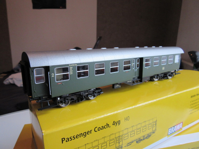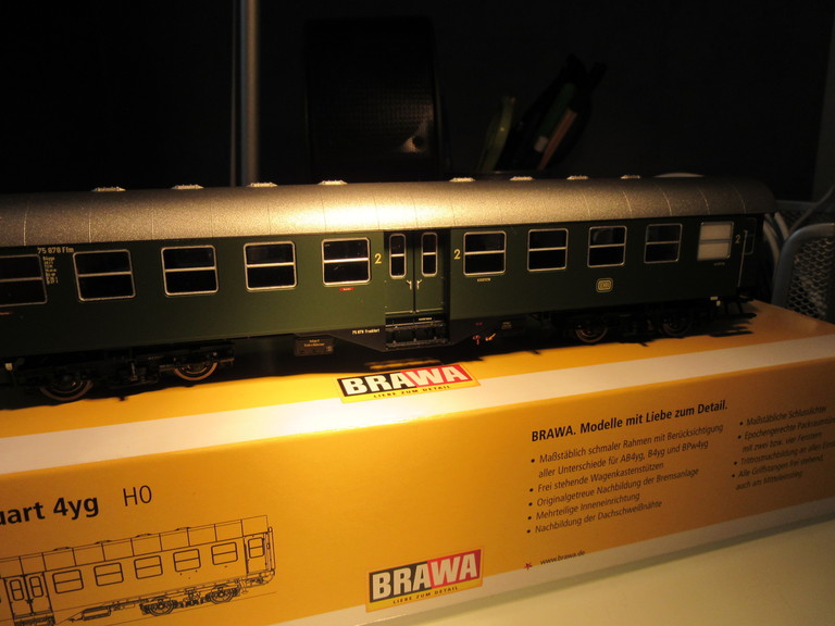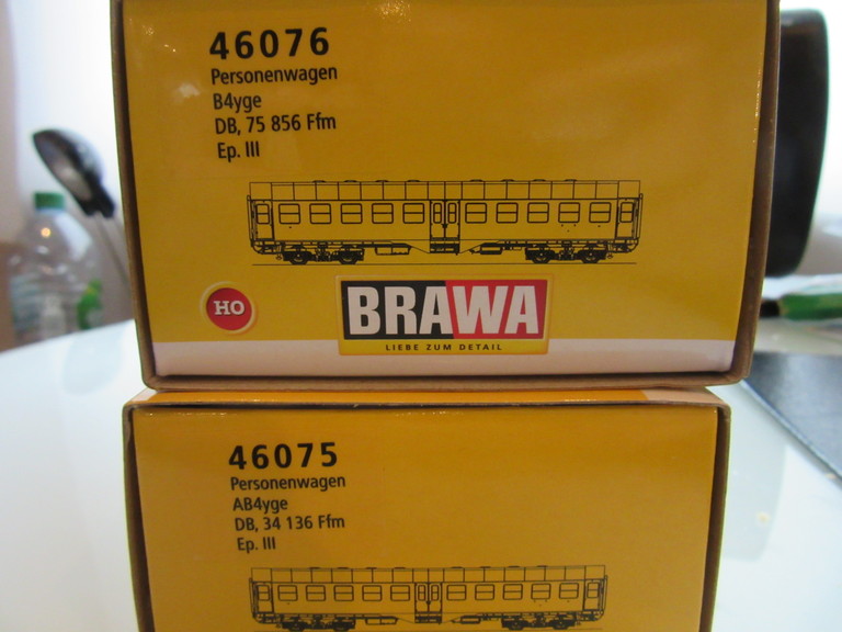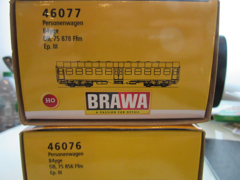 PS: Jetzt fehlt eigentlich nur noch der Wagen mit dem Gepäckabteil. Die Verpackungen (einfache Kartonschuber) sind zwar völlig ausreichend, aber gegenüber den tollen safeartigen Güterwagen Plastikkisten geradezu lächerlich einfach für Brawa