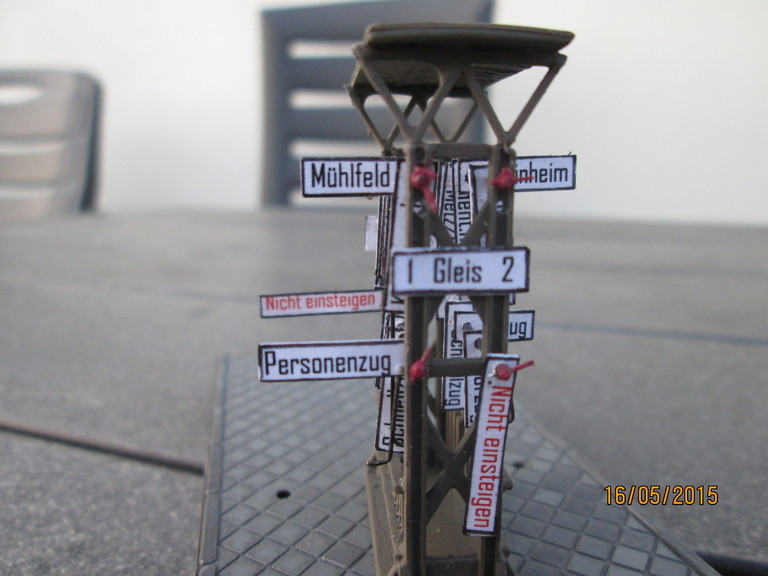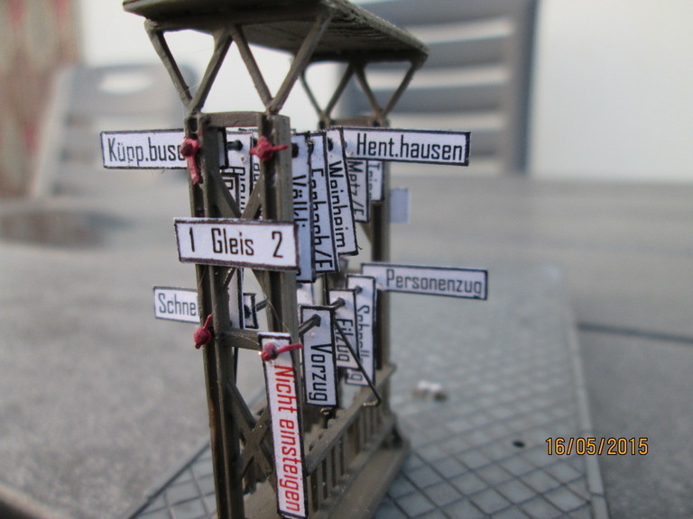 Ich weiß im Moment nicht ob Du schon mal bei mir warst im Trööt.......ich sage Dir erst mal herzlich Willkommen in Neustadt am Wald....für den Fall das ich das schon einmal gemacht habe sage ich Dir trotzdem herzlich Willkommen in Neustadt Schön das Du schreibst und ich sage Dir auch ein Danke fürs Feed back! was die Schilder angeht ist natürlich eine dauerhaft angebaute Mechanik schon schwierig. Das Dingen ist ja nicht sehr groß und ich hatte den Eindruck das genauso viel Stangen wie Schilder die Sache doch um einiges überfüllt hätte. Das sieht dann schnell zu voll und durcheinander aus. Also hab ich mich für die Variante mit den Stellstangen entschieden. Wie hier in Berlin: http://fotocommunity.s-bahn-berlin.de/al...fsvorsteher.jpg eine Stellstange für alle Schilder Die angefertigten Papierschilder sind recht robust und ich habe noch 15 in Reserve.Im Anlagenbetrieb wird der Wechsel sicher auch nur dann und wann stattfinden so das ich da keine Probleme sehe. Der 0,3mm Weinert Draht geht sehr sanft in die 0,4mm Bohrung . Grüße und gerne bis später sagt Willi