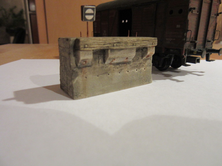 Das mit dem Hinterherkommen beruht ja auf Gegenseitigkeit. Schön das Du trotzdem Zeit gefunden hast mich zu besuchen...freue mich darüber. Der Betonprellbock ist echt ein schönes Modell. Ich bin im EM darauf gestoßen. Es gibt auch noch eine Holzversion. Etwas erschrocken war ich jedoch als der in weiß ankam, hatte ich das doch überlesen und eigentlich einen fertigen Prellbock erwartet. Jo und dann hat man ja schon etwas Bammel den nun beim Einfärben gleich zu "versenken" . Etwas irritiert war ich auch und bin ich eigentlich generell was einem so mancher Hersteller für Farben anbietet mit dem das entsprechende Modell zu bearbeiten sei. Die kannst Du gar nicht alle kaufen,irgendwas fehlt ewig. So bin ich mal wieder meinem Pelikan Farbkasten treu geblieben und habe angefangen mit stark verdünnten Farben (wie schon weiter oben erwähnt)den Bock zu lasieren. Erst mit Schwarz und dann mit Umbra. Hier und da etwas Farbe "drybrush" dazu getupft und dann mal mit einem Küchenkrepp abgewischt wenns zu stark schien oder mit dem nassen Pinsel etwas weggewaschen,bis er nach...ja...45 Minuten so aus sah....dann habe ich aufgehört Danach wurden noch aus 0,5mm Draht die Moniereisenreste ,die da oben rausschauen nachgebildet und angerostet. Auf der Frontseite wurde die ebenfalls weiße Holzimitatpufferbohle mit Umbratönen "Holz Like" lasiert. Hinzu kamen noch ein paar "Runterlaufrostspuren" der Verschraubungen,mit denen die hölzerne Bohle an den Betonklotz geschraubt ist. Alle Teile kamen einzeln und wie gesagt in weiß von "Bergswerk"! Danke für Dein Lob und gerne bis später sagt Willi 8)
