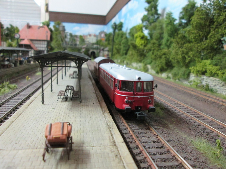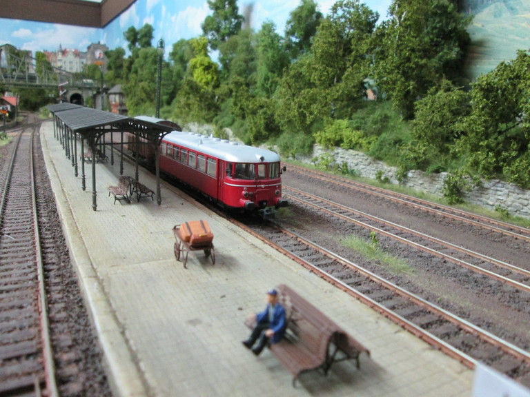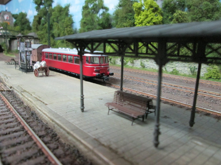 Hallo Peter Vielen Dank für Deinen erneuten Besuch. Ja der Bahnsteig von Neustadt ist ein ganz schöner Knochen. Das war das erste Bauwerk aus den Spörle Gipsteilen das ich gebaut habe. Die Übung war vor 7 Jahren noch nicht ganz so drinne und da hat eben hier und da mal etwas nicht ganz so gerade ausgeschaut. Der Betrieb und hin und wieder ein entgleistes Bahnfahrzeug haben den Gpiskanten schon einige Macken beigebracht, Dennoch,der Bahnsteig sieht auf den Bildern und in natura prima aus wie ich finde. Die Farbe gefällt mir und der ein oder andere Buckel sind nur realistisch. Ich denke wie Bahnsteige ausschauen wissen wir alle. Die ein oder andere Macke stammt eben vom Granatbeschuß aus dem gerade beendeten Krieg. Dieser Bahnsteig macht viel des Charmes in Neustadt aus wie ich finde. So einen "schabby Look" ist eigentlich das was ich auch wollte..eben 50er Jahre.