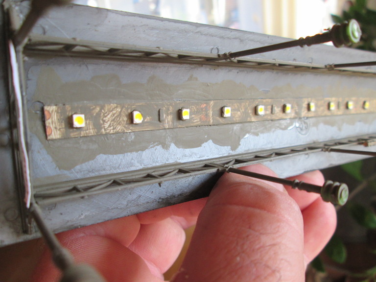 Lautsprecher und das Dach von innen müssen heute noch einmal deckend lackiert werden...bin gerade dabei. Die Lichtfarbe ist auf jeden Fall warm. An einen kleinen GFN Trafo angeschlossen,der die Dioden mit Gleichstrom beschickt (also dimmbar weil der Fahrspannungsausgang des Trafos genutzt wird) läßt sich ein schönes warmes Licht einstellen,wie es wohl von Lampen vor der Neonröhre erzeugt wurde. Obwohl Neonröhren schon kurz nach dem Kriege zur Verfügung standen und ein kaltweißes Licht somit auch richtig wäre.
