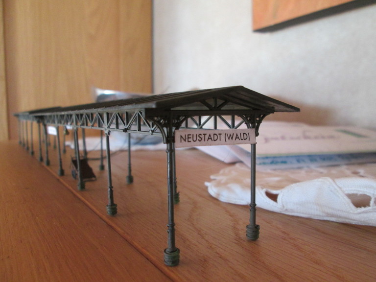 Du hast ganz richtig getippt. Faller 120204 Bahnsteig Waldbrunn. Allerdings wurde der Bahnsteig farblich "umgedreht". Das eigentlich graue Dach wurde mit Umbra gestrichen und in die nasse Farbe wurden Asoa Pigmente Ruß eingebracht. Ergebniss ...mattes schwarzbraun. Die "Beine" und die Dachunterkonstruktion wurden dagegen von schwarz unter aufbringen von Anta Decor Lava in grau verwandelt. Bin gerade dabei die Dächer mit Beleuchtung auszurüsten und ein paar Weinert Lautsprechern sowie Bahnhofsnamen. Einbau erfolgt in Kürze.Danke für Deinen Besuch und Deine guten Wünsche!!