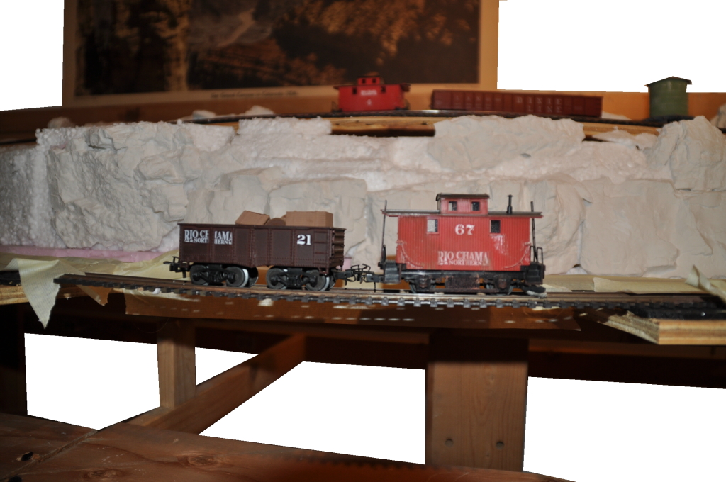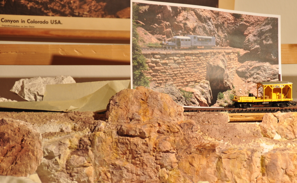 Gestern abend habe ich mich mal an die Farbgestaltung der Felsen gemacht. So ganz zufrieden bin ich nicht damit, aber mal abwarten bis es durchgetrocknet ist. Momentan sieht es etwas "wasserfarbkastig" aus. Aber im Vergleich zum Muster (Rock Tunnel am Cumbres/Toltec) eigentlich gar nicht so schlecht. Und wenn da erst mal Geröll zwischen den Felswänden rumliegt....