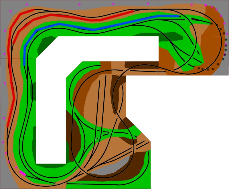richtig: Sidings kann man nicht genug haben. Momentan habe ich 2 mit jeweils ca. 2 Metern Länge, rot markiert - also könnten schon mal 3 Züge gleichzeitig im visible Bereich sein. Und wenn man die "Tal-Strecke" teilweise im Linksverkehr fährt, kommt noch das blaue Siding dazu.