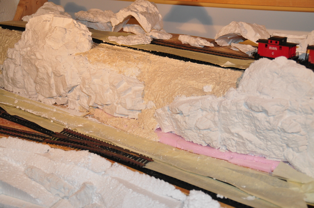 Der Plan ist, zu warten bis das alles getrocknet ist und zu schauen, ob es funktioniert. Dann, nachdem die Felsen bemalt sind, werden diese Flächen mit Ground Cover, Foam, Sand und Steinchen bedeckt, bis es fertig ist. Das ist zumindest der Plan. Nur klappen muss er.....