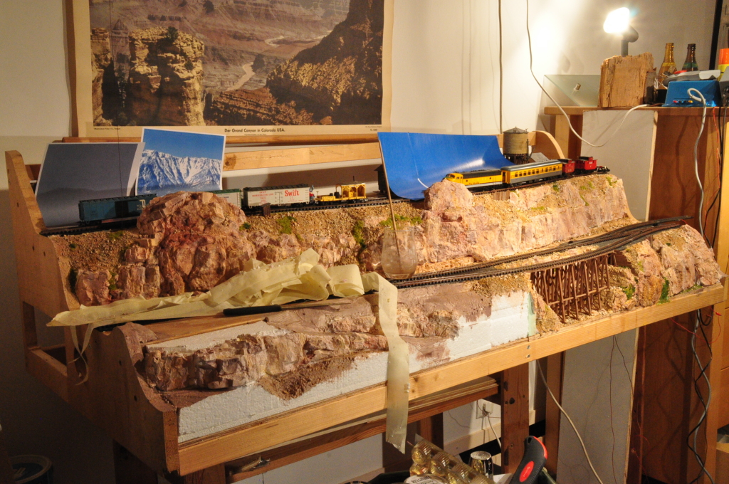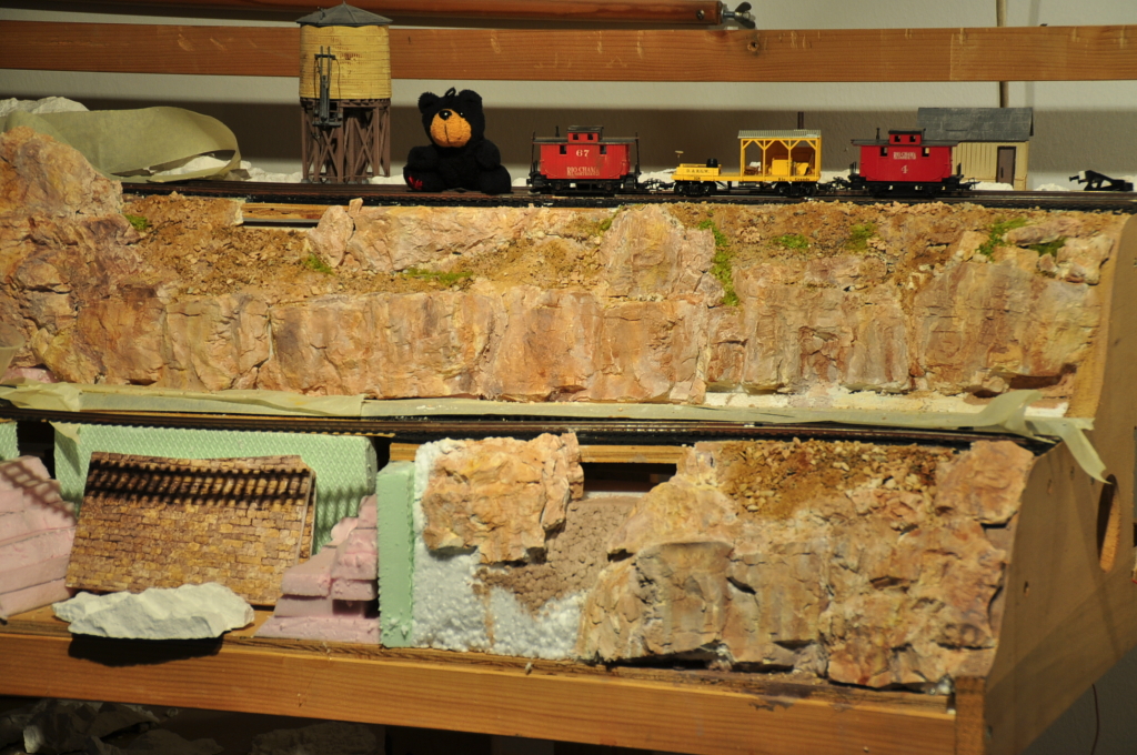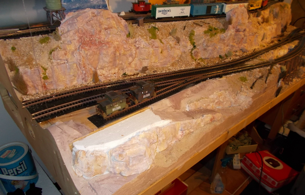Heute habe ich mich etwas an den Felswänden am linken und rechten Anlagenvordergrund verkünstelt. Ich habe das Gefühl, daß ich absichtlich extra langsam mache, da ich mich nicht so richtig an die Farbgebung der Felsen herantraue. Und natürlich an die noch zu bauende Trestle und den Steilhang direkt dahinter. Da fehlt mir noch der Plan, erst die Brücke, dann die Umgebung - oder umgekehrt ?
