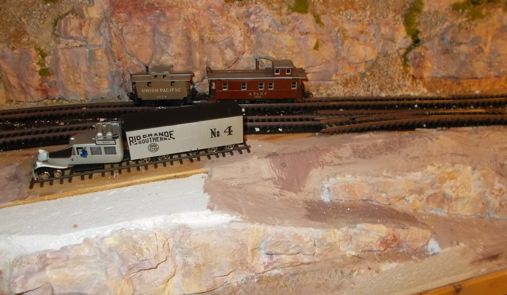 Und nachts, heimlich, wenn keiner schaut, dann stelle ich eine Galopping Goose aufs Gleis. Maßstab 1:64, Spurweite 3 ft. (Sn3, wie der Amerikaner sagt)...ginge auch als H0 durch, wenn man nicht so genau hinschaut: