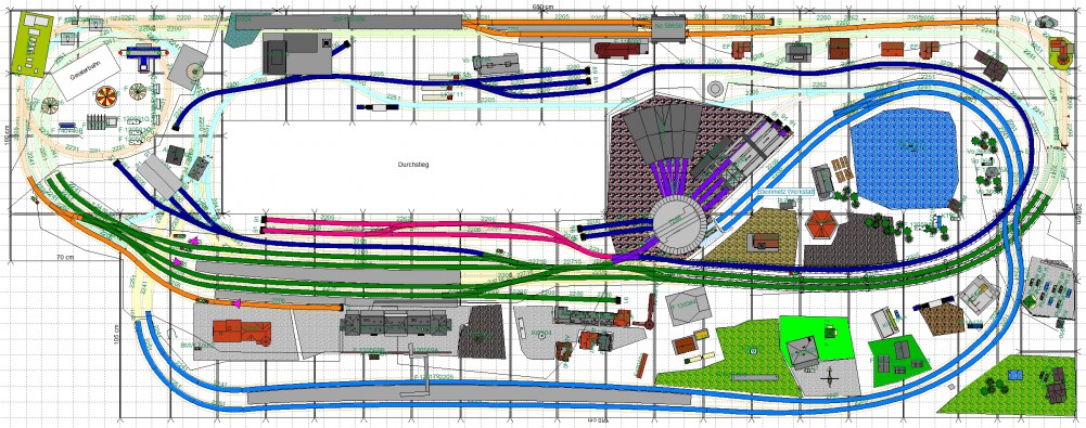Mein Problemkind ist die Anbindung der "Güterabfahrt", das ist das dunkelblaue Gleis das oben parallel zur Plattenkante läuft und dann im 180 Bogen unterhalb der Drehscheibe endet. Die pinkfarbenen Gleise waren als Mini-Güterbahnhof gedacht, in Kombination als Abstell- und Ausziehgleis, so daß man ggf. auch eine Zugfolge umbauen kann ohne die Waggons in den Bahnsteigbereich fahren zu müssen. Wenn ich das beibehalte, ist zwischen Bahnhof und Drehscheibe in der Hauptstrecke kein Platz mehr für eine Weiche in Richtung Lokschuppen - den müßte ich dann am obersten Bahnsteig-Gleis anschliessen, womit der Rangierverkehr wieder den Linienverkehr beeinflusst....