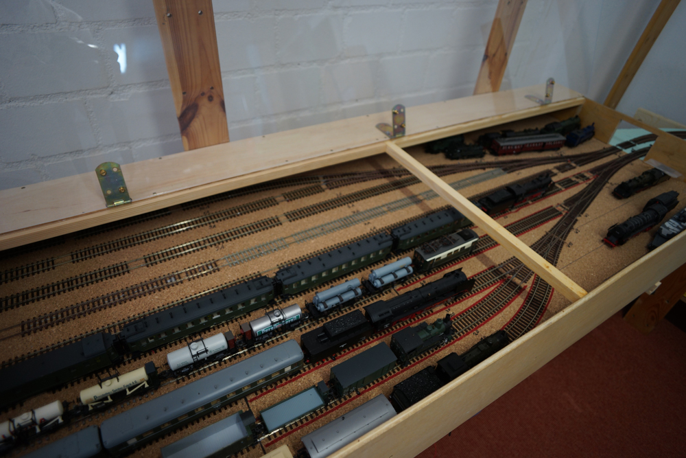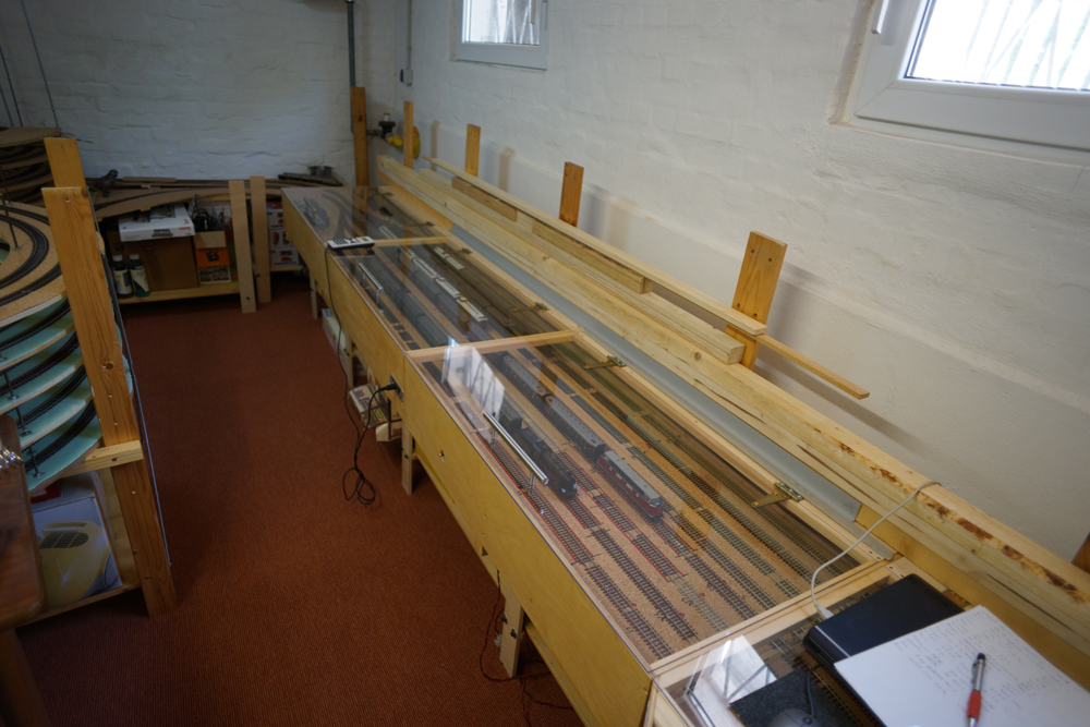 Dank der Plexiglasabdeckung mußte ich die Loks und Wagen nicht in Sicherheit bringen und der gesamte Schattenbahnhof blieb staubfrei beim Sägen und Bohren. Den Rahmen für den Bahnhof werde ich in Modulbauweise erstellen, sodass ich ihn problemlos wieder abbauen könnte. Auf dem nächsten Photo habe ich mal ein unfertiges Modul zur Probe aufgestellt: