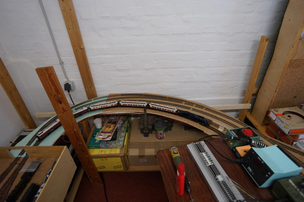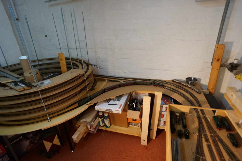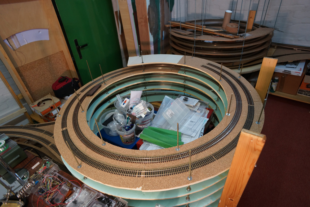 2 Gleise führen zur Gleiswendel nach oben und die anderen 2 Gleise bilden eine Schlaufe zum Wenden und führen zurück zu den Abstellgleisen, damit die Züge später wieder aus der gleichen Richtung an die Oberfläche zurückkehren. In meinem Planungsthread habe ich eine Skizze hochgeladen, die die Streckenführung des Schattenbahnhofs schematisch zeigt.