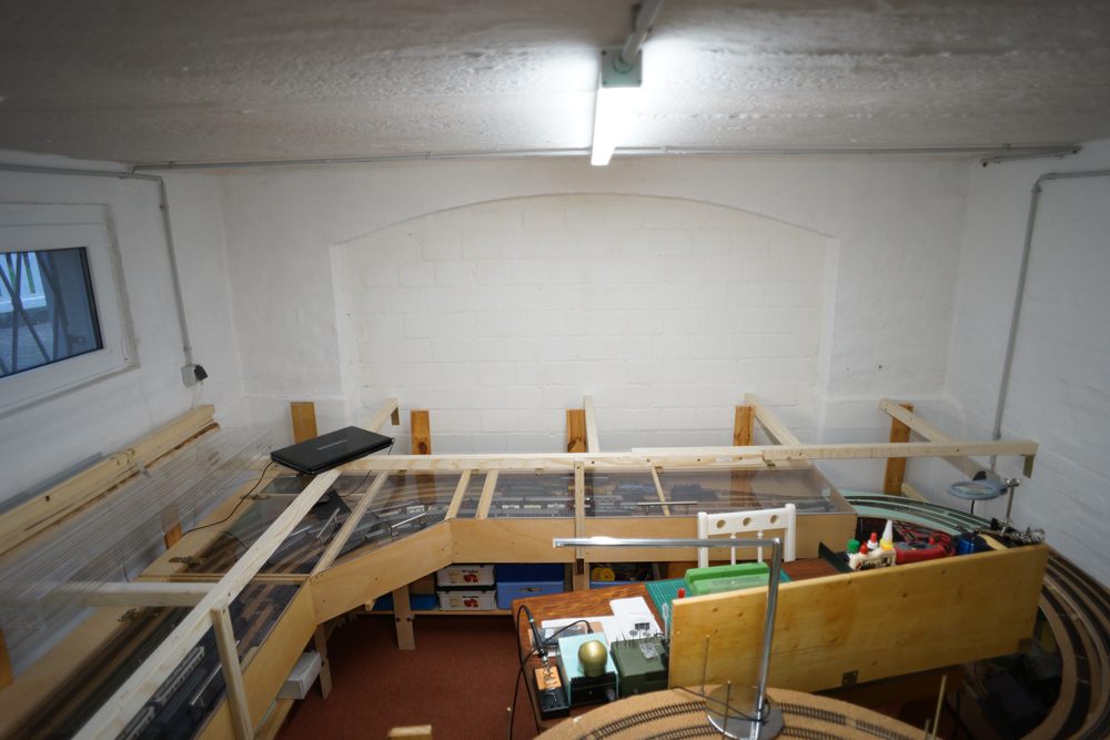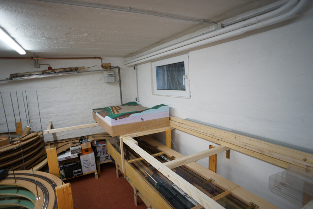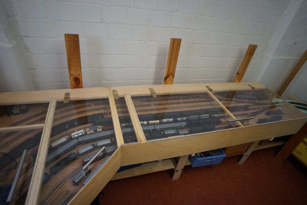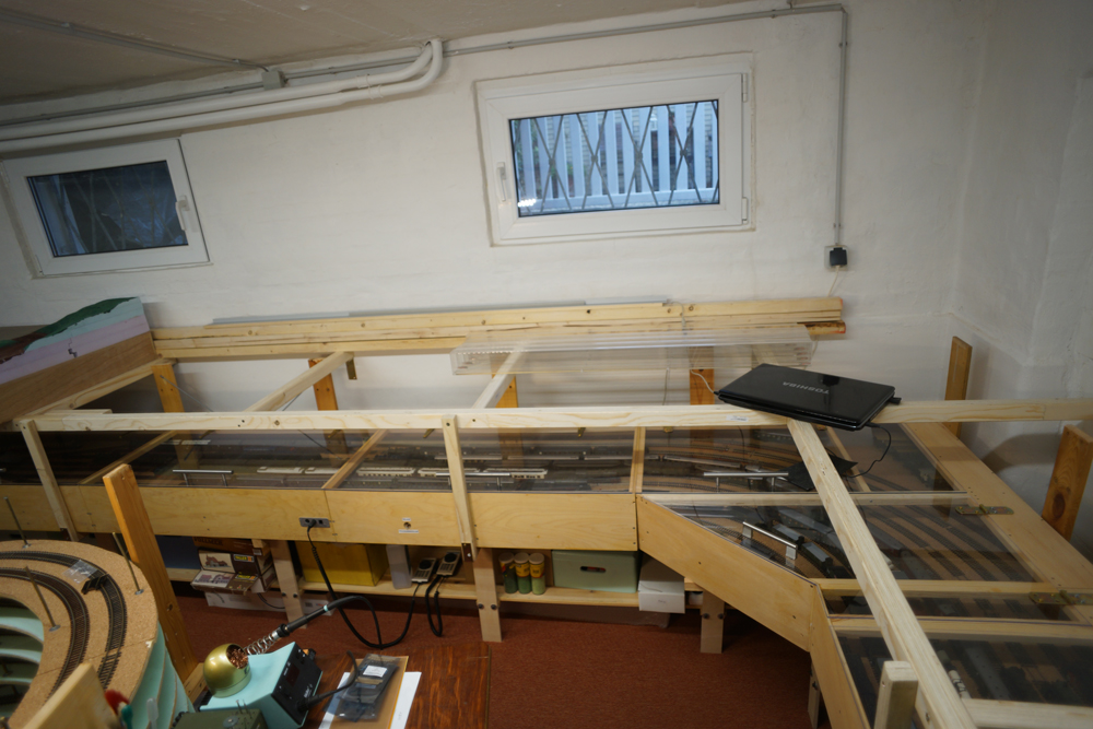 Das mit den Plexiglas-Scheiben über den Schattenbahnhof ist gut, nur frage ich mich, wenn da eine Ebene drüber kommt, ob du die Scheiben dann noch so öffnen kannst wie gerade gezeigt? Oder ist die Ebene dann 50cm über dem SBF?