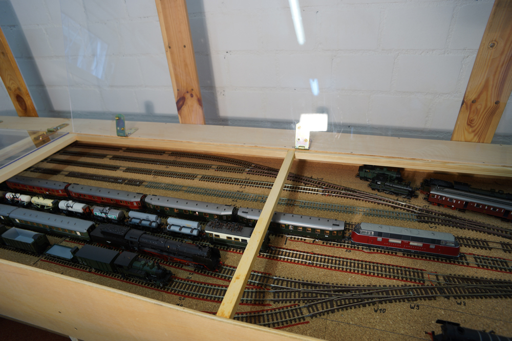 @ Matthias: Die Plexiglasscheibe befindet sich 69 cm über dem Fußboden. Später werde ich die Scheiben mindestens 30 cm weit öffnen können und sie an den ehemaligen Küchentürgriffen in die Kästen der nächsten Ebene einhängen können. Die 30 cm haben bei Versuchen ausgereicht, um an die Züge zu kommen. Die nächste Ebene soll bei 99 cm oder noch etwas höher beginnen.