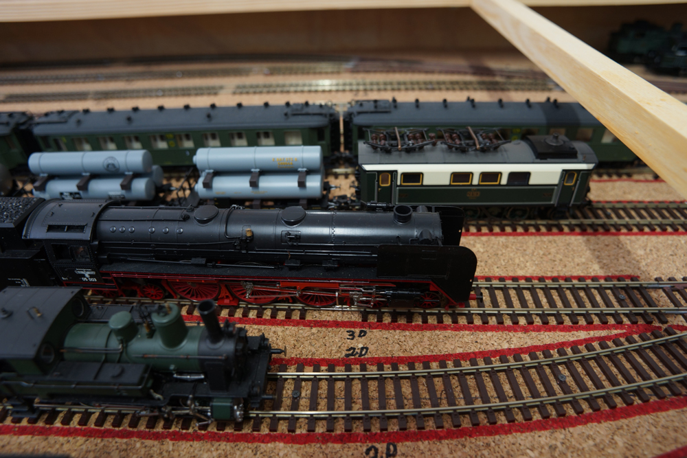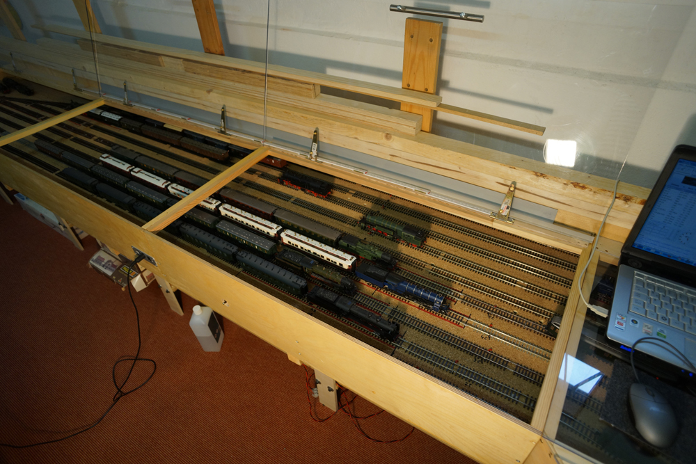 Zitat Später werde ich die Scheiben mindestens 30 cm weit öffnen können und sie an den ehemaligen Küchentürgriffen in die Kästen der nächsten Ebene einhängen können. Die 30 cm haben bei Versuchen ausgereicht, um an die Züge zu kommen. Die nächste Ebene soll bei 99 cm oder noch etwas höher beginnen.
