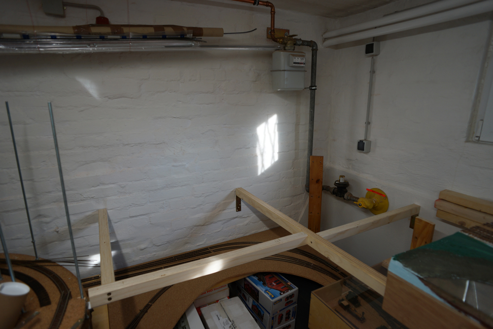 da sich viele Sorgen wegen der Gasleitung machen, habe ich diese Ecke fotografiert. Die Verschraubung des Zählers ist auf 1,8 m Höhe. Ich komme im Stehen problemlos an den Zähler und könnte ihn abschrauben. Wenn ich dann noch den einen Querträger entfernen würde (5 Schrauben), stände ich seitlich direkt am Zühler und 40 cm von der Wand entfernt, wo sich auf dem Bild der Kibri Ringlokschuppenkarton befindet. Durch den Regalboden würde man auch etwas höher stehen. Ich denke man kommt gut an den Zähler. Die geplanten Bahnhofsmodule werden sowieso leicht entfernbar sein, um sich bei der Gestaltung so wenig wie möglich zu verrenken. Die Fläche hinter der äußeren Kurve zur Gasleitung und die senkrechte Ikea Leiste in der Ecke werden noch entfernt, sodass ich mich bei Bedarf in die Ecke stellen könnte.