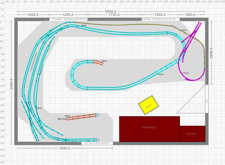 Und jetzt das Problem. Ich habe zwar genaue Vorstellungen davon was ich will und habe auch schon einen Plan dazu erstellt, aber irgendwie bin ich mir sicher, dass das nichts taugt. Deshalb habe ich den Fragebogen nach besten Wissen und Gewissen ausgefüllt. Habe mir da echt viel Gedanken drüber gemacht. Eine Gleisplanidee zumindest für die sichtbare Etage ist unten im Anhang zu finden.