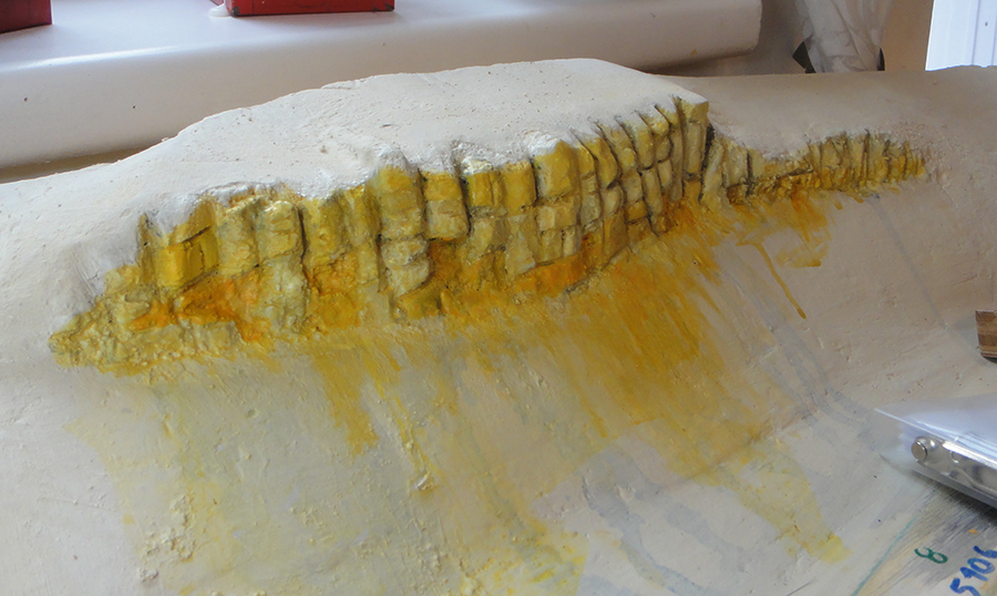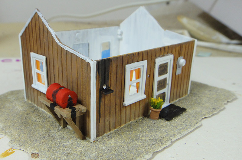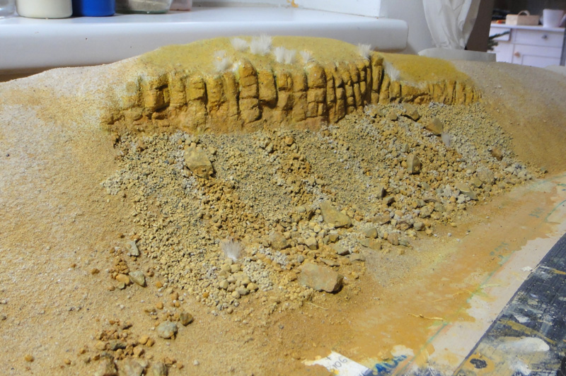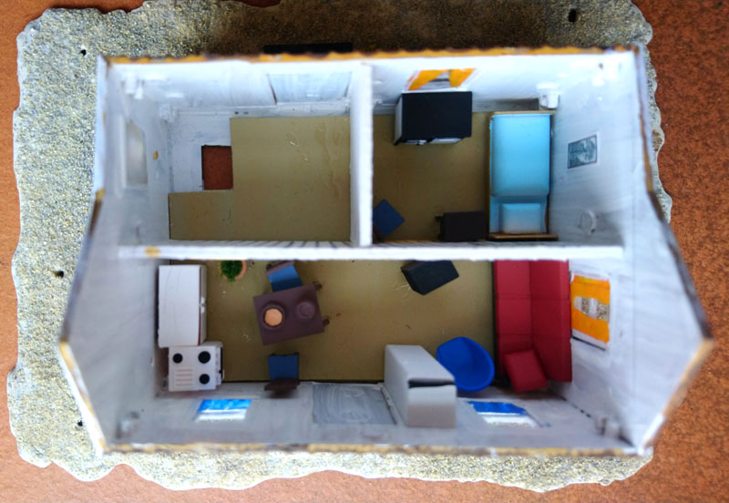 Überblick über meinen Bastelplatz in unserem Wohnzimmer - schön hell und v.a. warm. Hier zeigt sich für mich deutlich der Vorteil der Segmentbauweise: Die Segmente, die ich in Arbeit habe, kann ich im Wohnzimmer aufbauen und dort gemütlich arbeiten.
