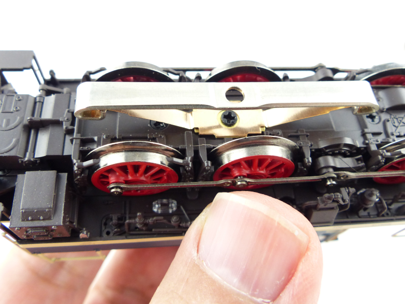 Die Feder zur Ausrichtung des Schachtes in Mittelstellung sollte schon vor dem Einbau erfolgen. Unter der nur zur Seite geschobenen Bodenplatte der Lok ist das Einhängen der Feder an Schacht und Kulisse ein Geduldsspiel, das ich nach etlichen Versuchen entnervt aufgegeben habe und die Kulisse nochmals ausgebaut habe.
