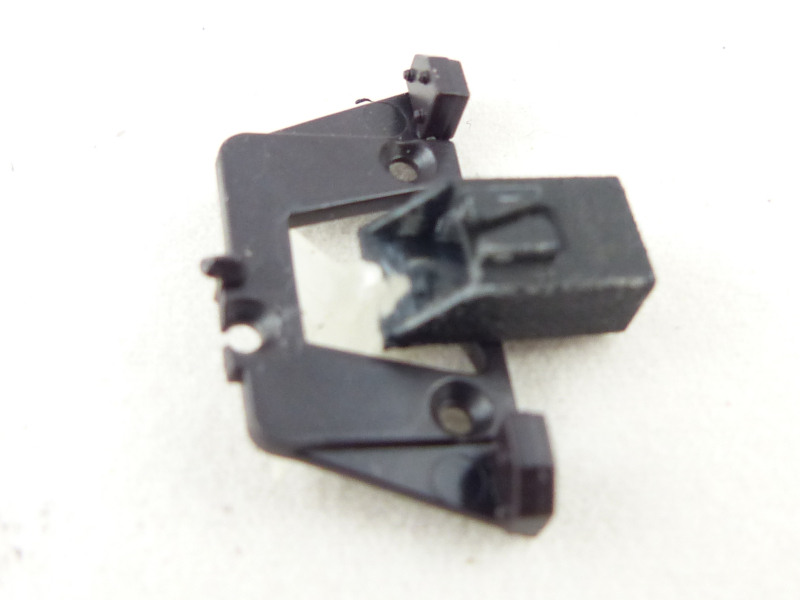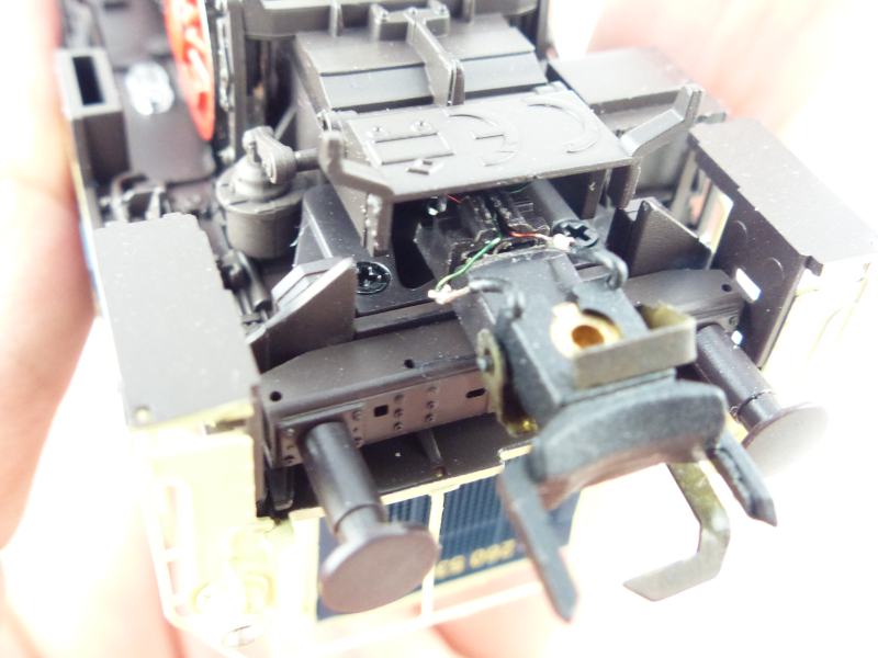 Zum Ausbau des NEM-Schachtes muss zuerst an der Unterseite die Fahrwerksabdeckung mit zwei Schrauben gelöst werden, bei meinem AC-Modell zusätzlich auch der Schleifer. Es empfiehlt sich, zuerst den Schleifer zu lösen, da man dann leichter an die vordere der beiden anderen Schrauben gelangt. Dabei ist mir aufgefallen, dass die drei Schrauben zwar sehr änhnlich sind, aber die beiden äußeren Schrauben haben ein Metallgewinde, die Schleiferschraube sieht nach einer selbstschneidenden Schraube aus, also beim Wiederzusammenbau nicht die Schrauben verwechseln.
