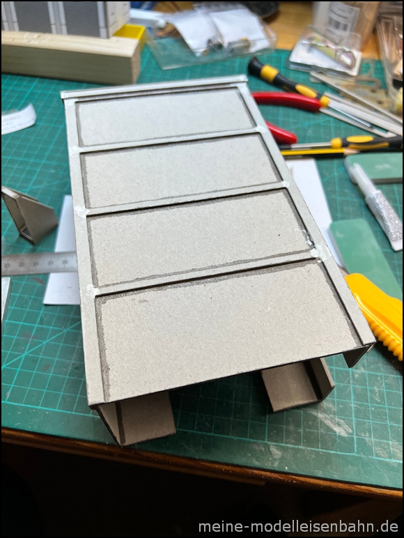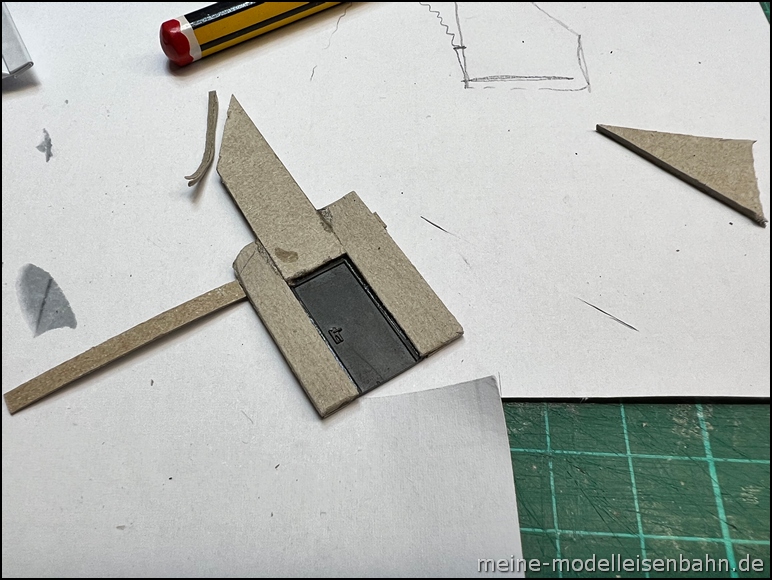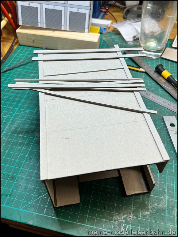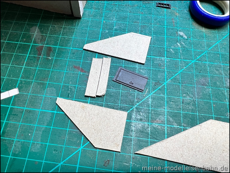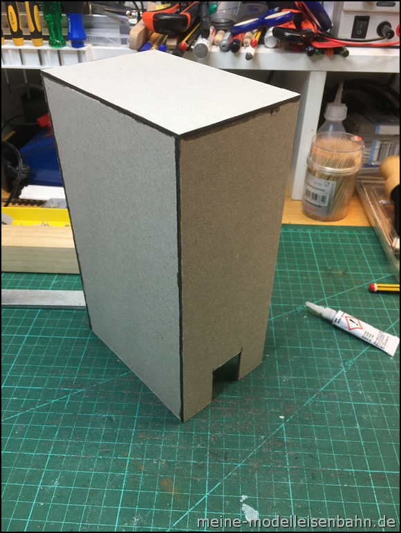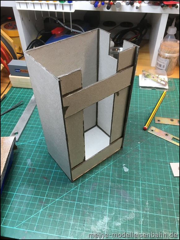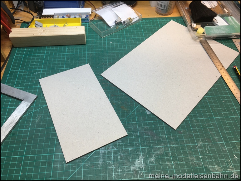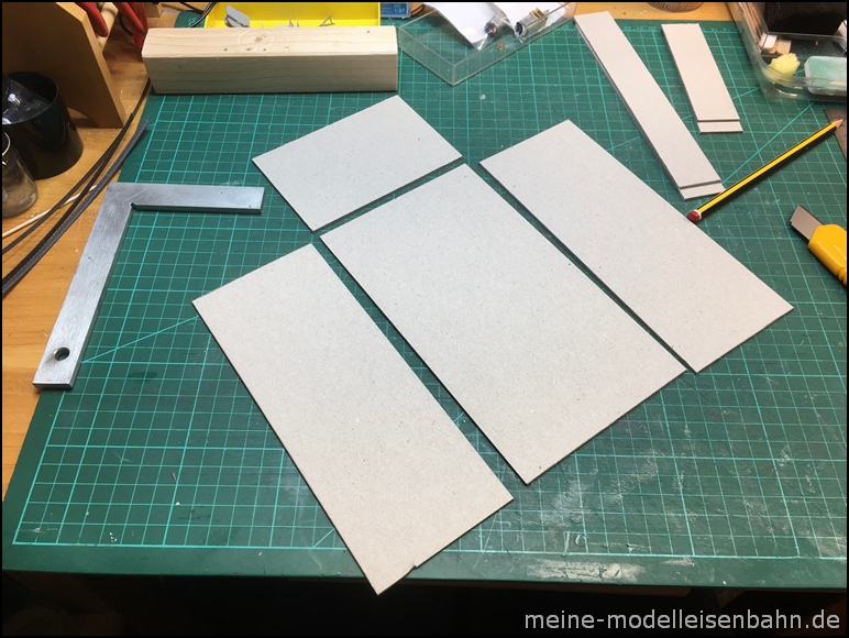 Ich habe jetzt schon einmal die Gebäudeteile aus 1,5mm Graupappe ausgeschnitten und die Seiten zusammengeklebt.