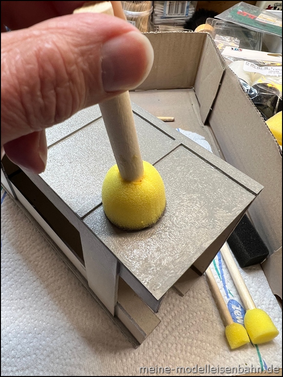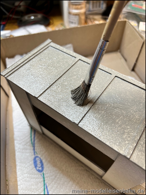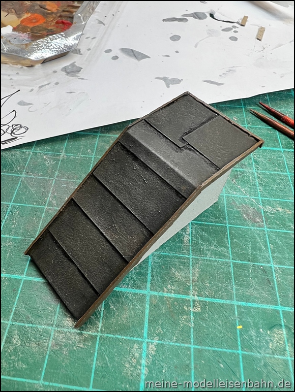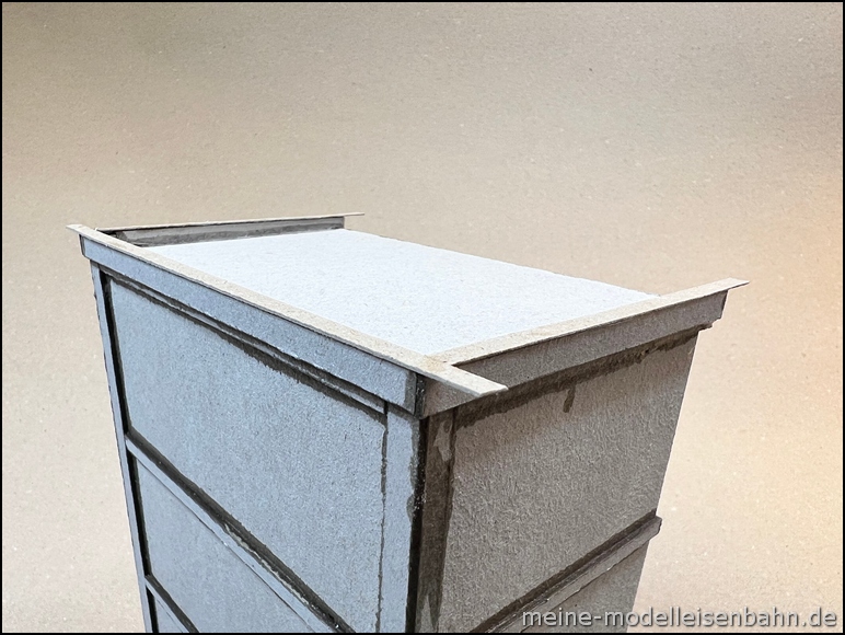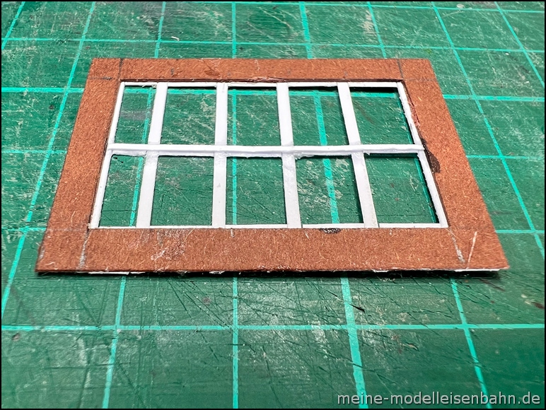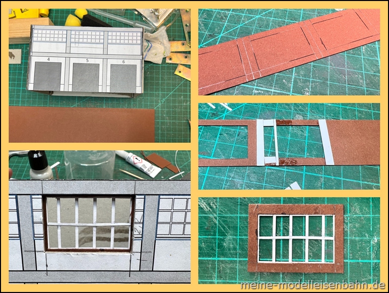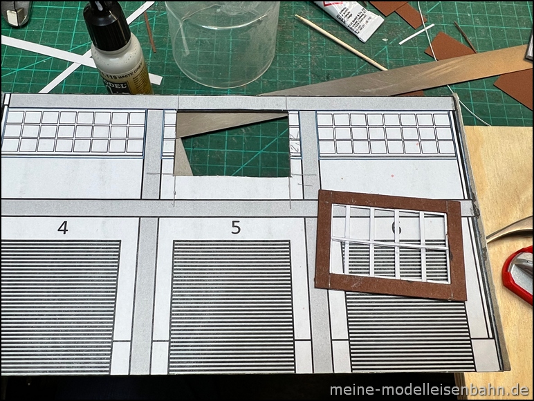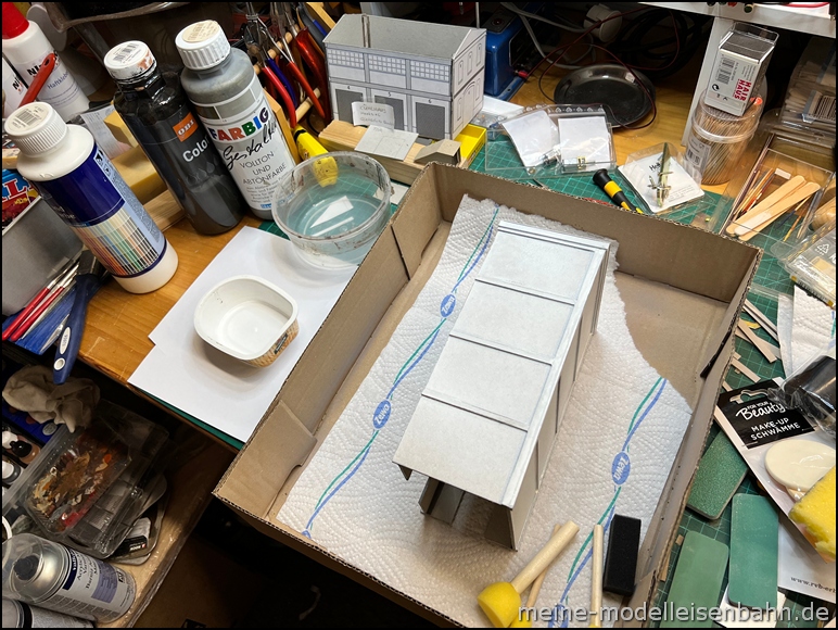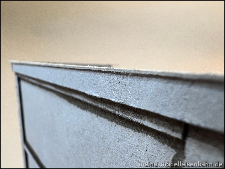 Ich habe jetzt schon einmal die Gebäudeteile aus 1,5mm Graupappe ausgeschnitten und die Seiten zusammengeklebt.