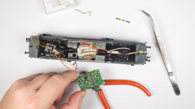 Leider funktionierte der Motor nicht. Ein Kabel war ab, ist wohl bei der Fehlersuche abgerissen. Nach dem Anlöten - nichts. Der Motor wollte noch immer nicht. Wieder die Verkabelung kontrolliert, Spannungen gemessen. Alles in Ordnung. Daraufhin habe ich, bin ja lernfähig, alle Kontakte des PluX-Sockels nachgelötet: Der Motor läuft!