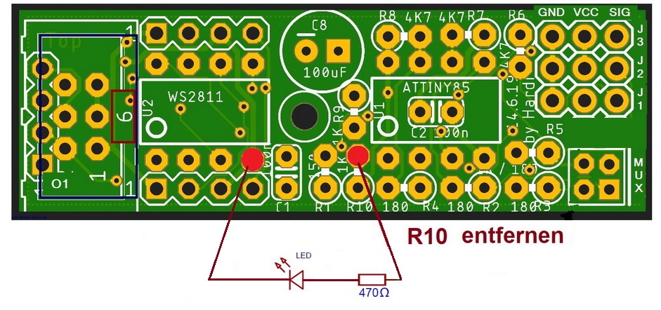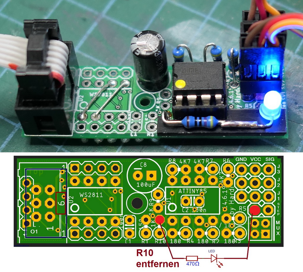 Da ich die Glühlampe durch eine LED ersetzt habe, mußte noch eine "Schokoladentafel-WS2811" nach dem Wannenstecker (auch hier wird Dominik erkennen was ich da als Platine verwendet habe...) eingefügt werden. Von dort geht es weiter zur verkürzten DMS-Platine von Michael.