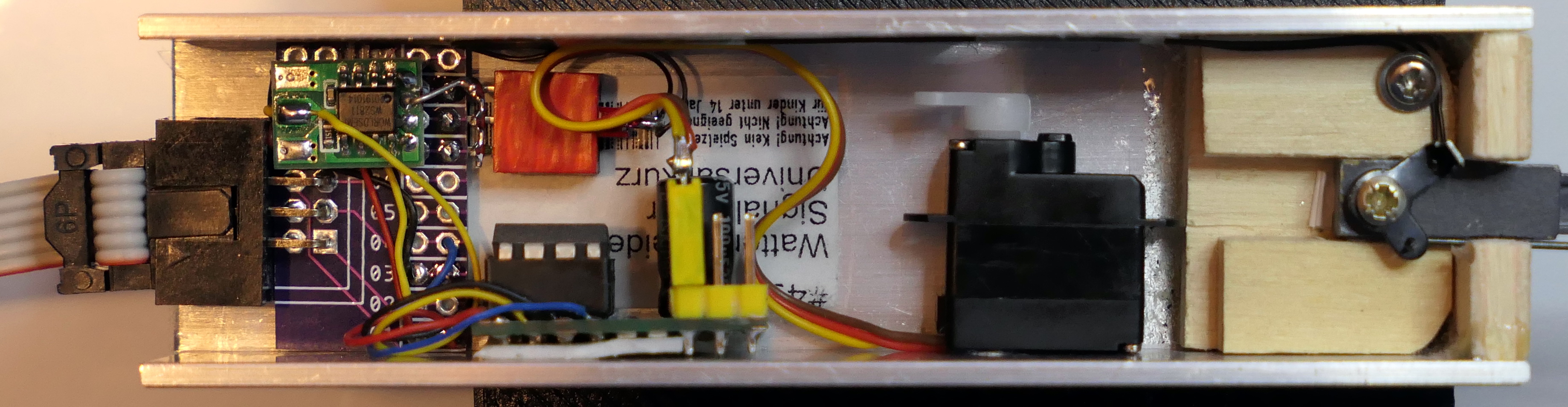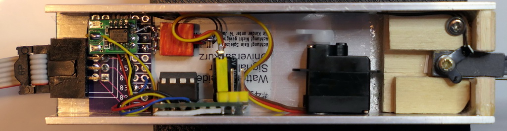 Als Servo ist ein 2g-Servo aus China im Einsatz. Das passt in das 20x30mm U-Profil ohne Anpassungen rein und verträgt auch 5V. Nicht wie das 1.7g-Servo, welches bei der Spannung seinen Geist aufgibt...