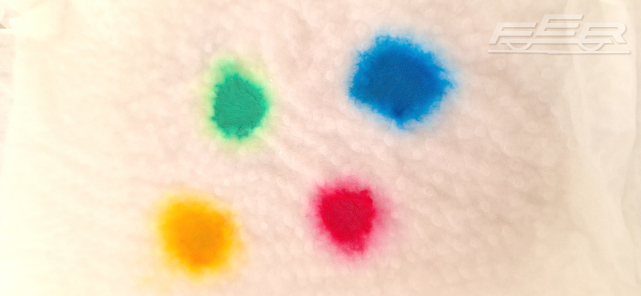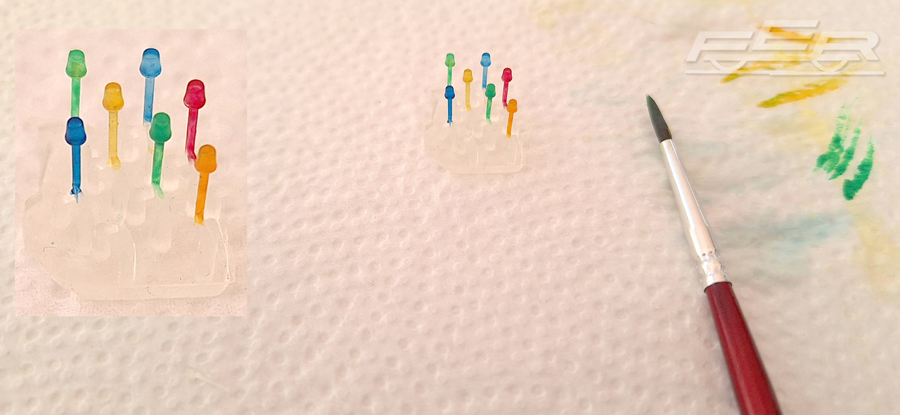 Man sieht im vorderen Bereich die vier kräftigen Farben die mit dem ersten Pinselanstrich von feuchtem Küchenrollenpapier stattfanden. Die Pole/ Gestänge an den Unterseiten können auch geschwärzt, bzw. der entsprechenden Farbe angepasst werden, die die Fahrzeuge dann mit sich bringen sollen. Ob, und wie sich das dann verhält, werde ich noch herausfinden, und welchen Kleber ich dafür verwenden kann.