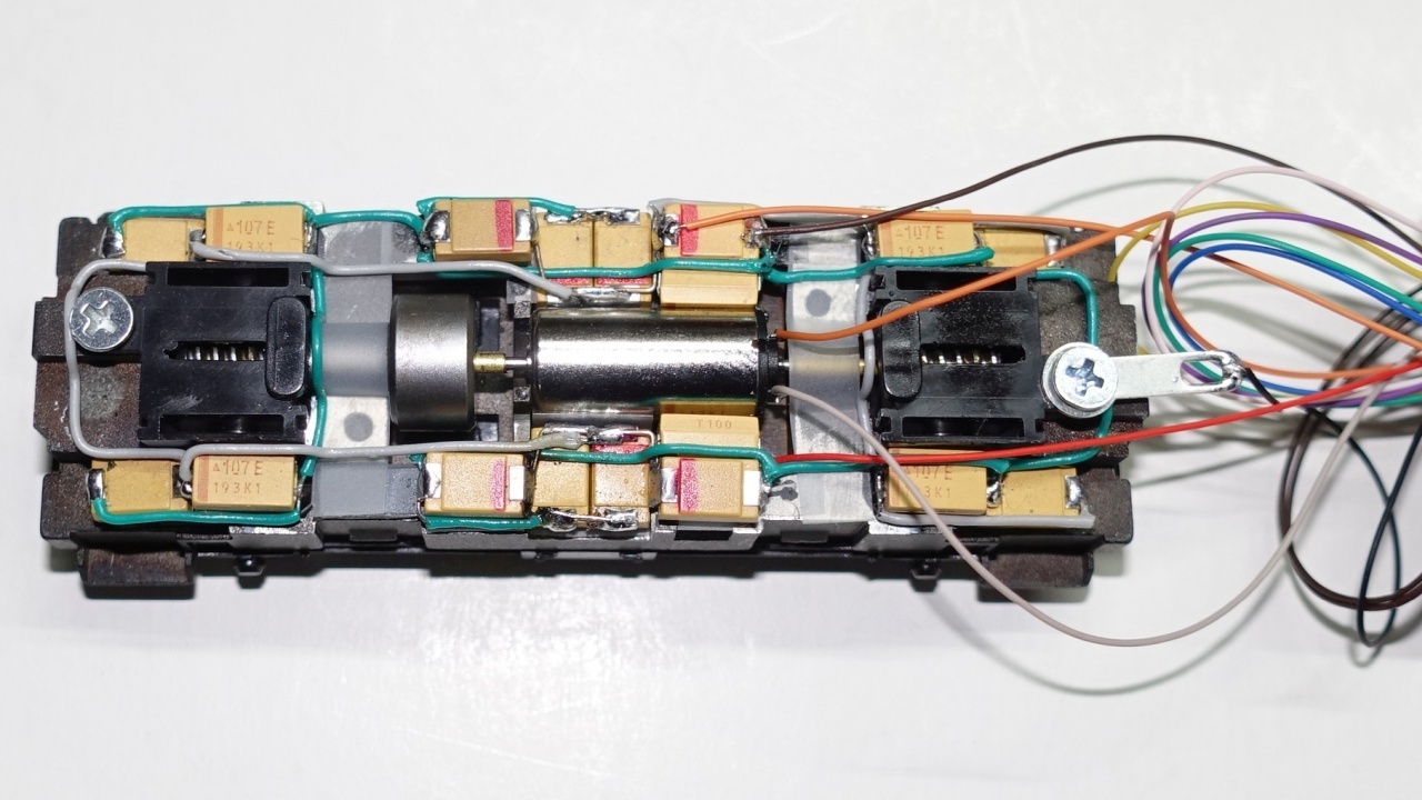 Die Überlegung, den Pufferspeicher aus kleinen Tantal-Kondensatoren zu je 100µF unter das Dach zu bauen, habe ich schnell wieder fallen lassen, da ich mir dann den Platz für Lautsprecher und Decoder verbaue und die vielen kleinen Lücken im zerklüfteten Fahrgestell dann ungenutzt bleiben würden. Also genau anders herum: Lautsprecher und Decoder unter das Dach und den Pufferspeicher im Fahrgestell unterbringen.