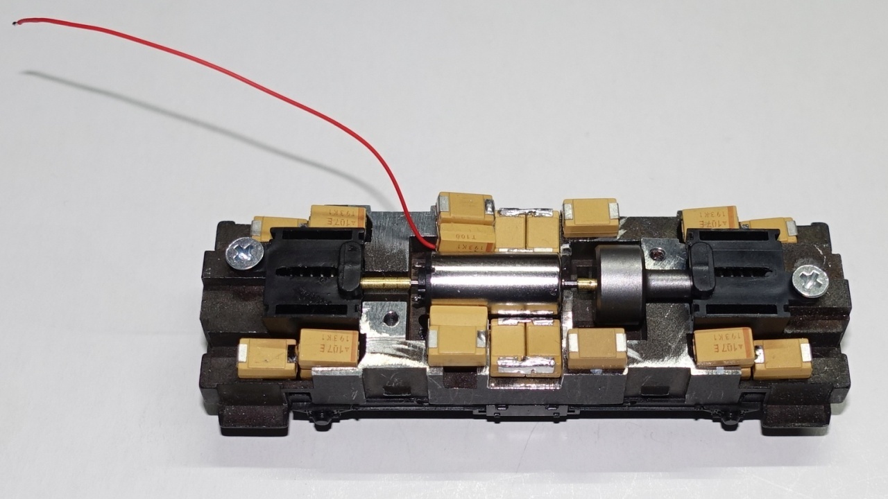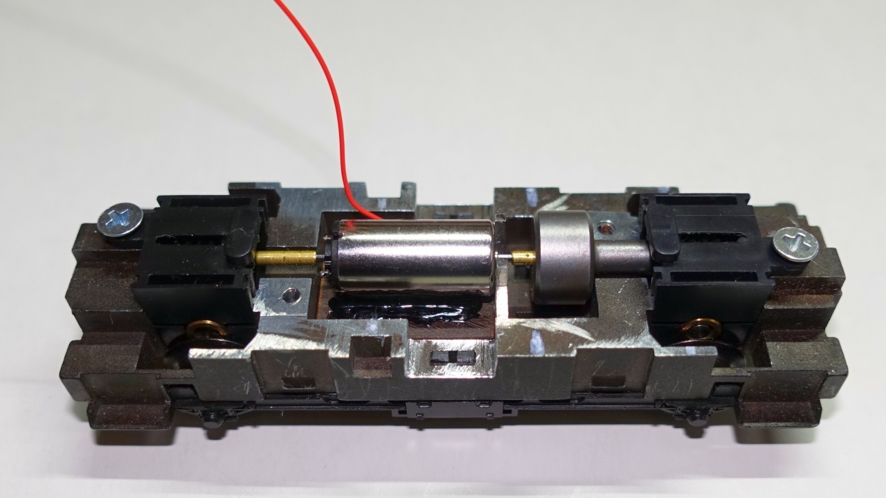 Das Plättchen samt Motor kann so reversibel von unten mittels M2 Schraube fixiert werden. Das Gewinde im Fahrgestell, welches wohl mal für die Befestigung des Schleifers vorgesehen war und nicht benötigt wird, habe ich auf 2,2mm aufgebohrt.