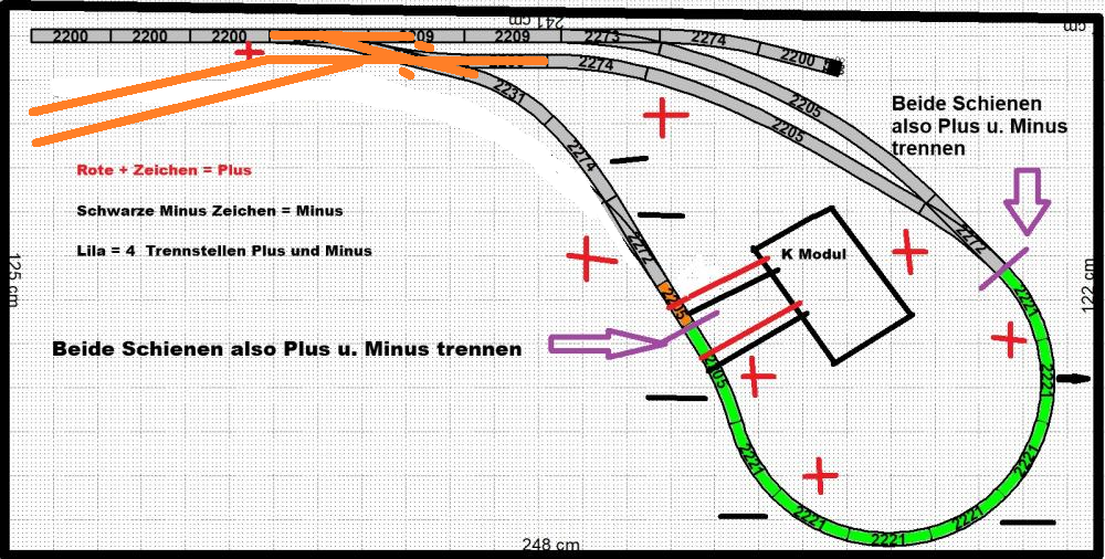 siehe bitte Bild, vor der Weiche ist eine Orangene Schiene daran Plus und Minus als Ausgang.